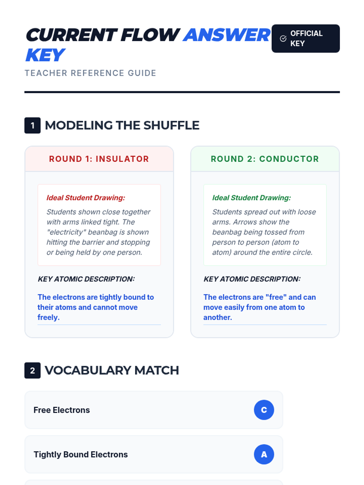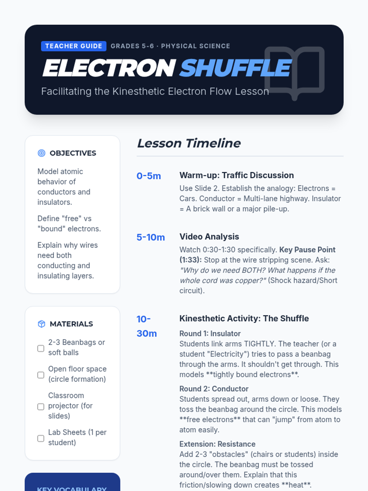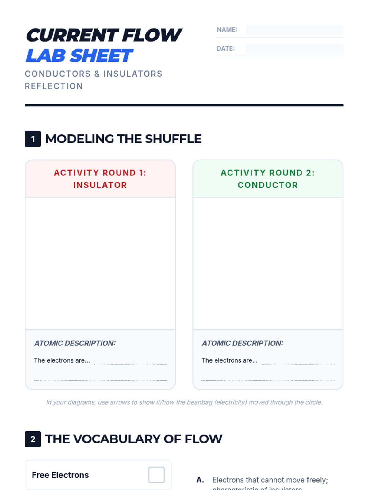 Students explore the atomic behavior of electricity by modeling 'free' and 'bound' electrons through a kinesthetic activity, followed by a video analysis and diagrammatic reflection on conductors and insulators.