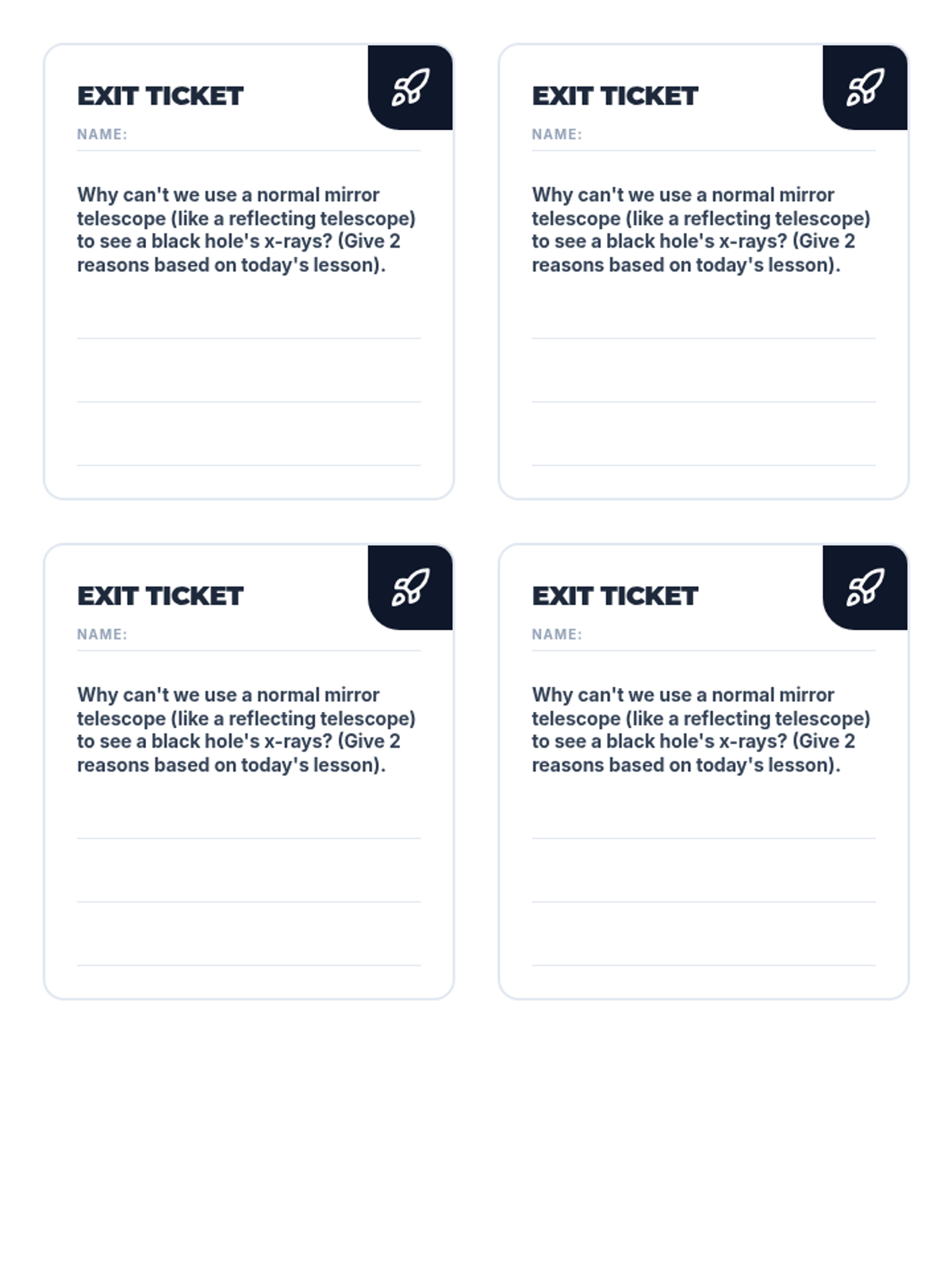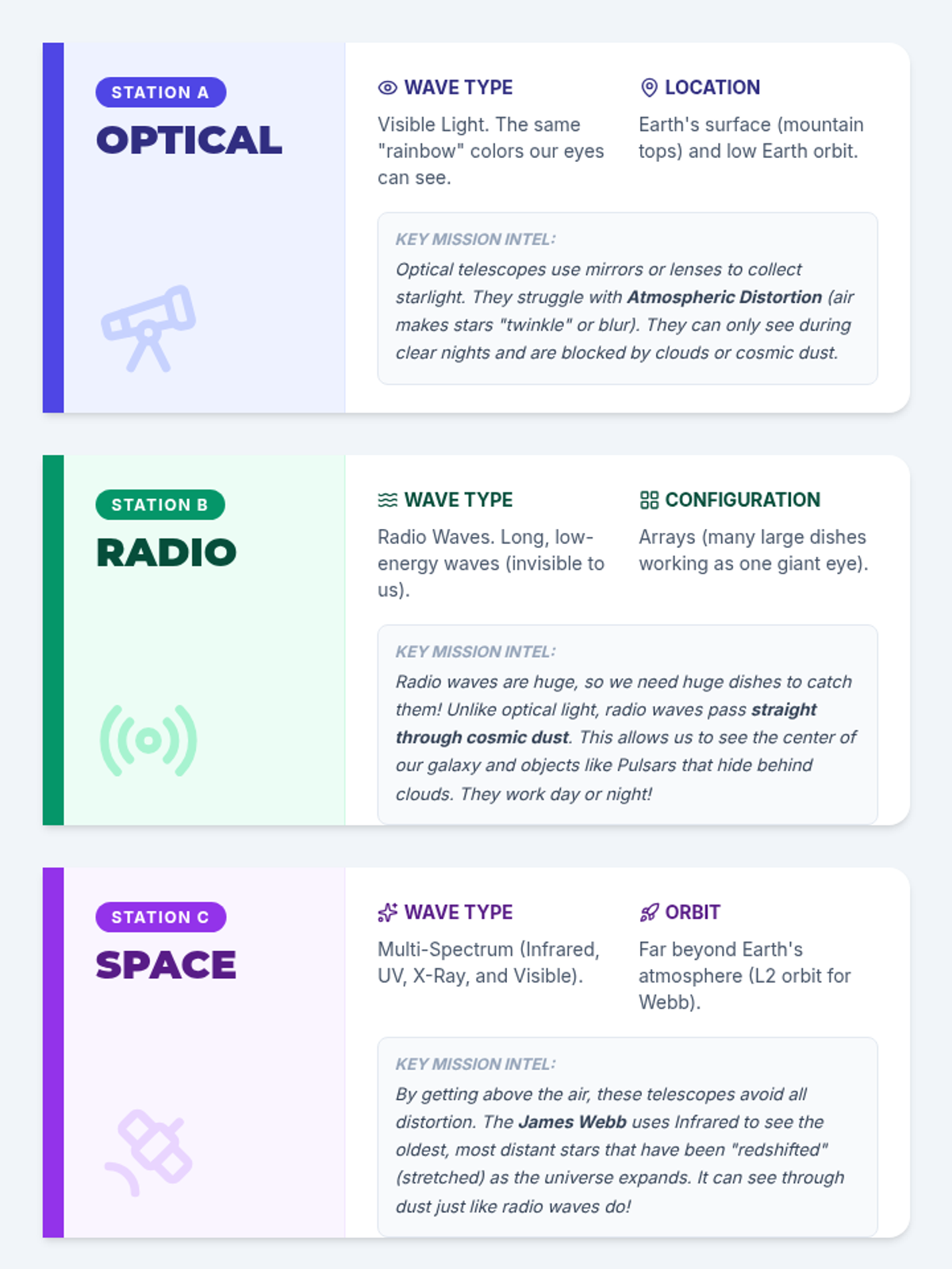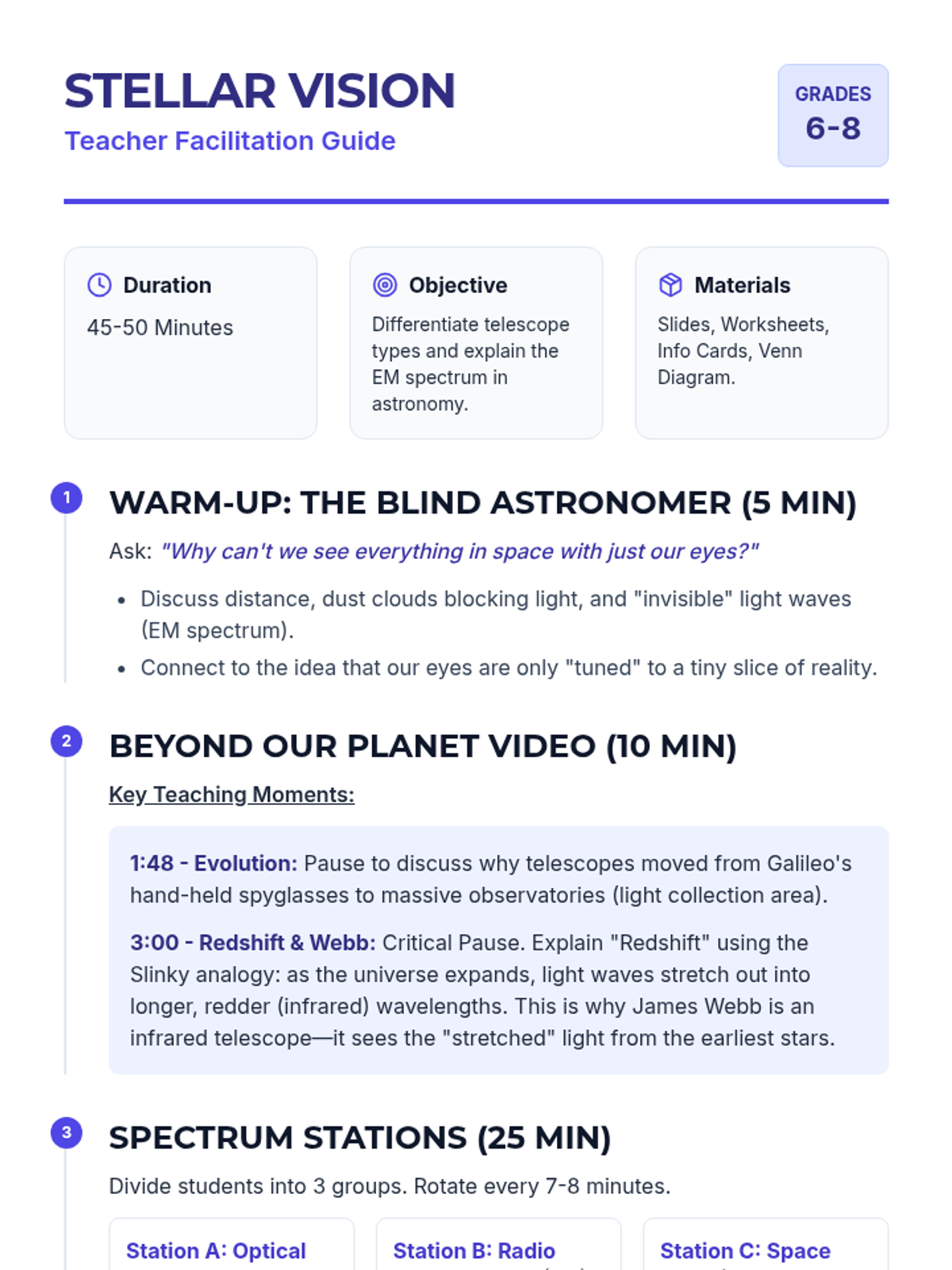 Students investigate how astronomers use different parts of the electromagnetic spectrum to explore the universe, comparing optical, radio, and space telescopes through a video-guided discussion and a station-based rotation activity.
