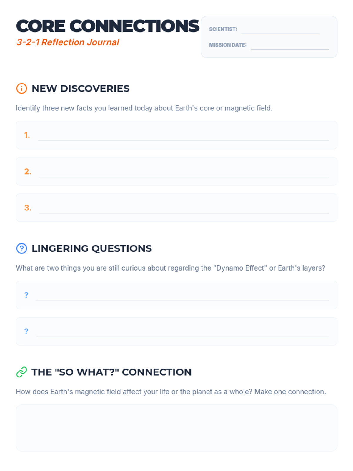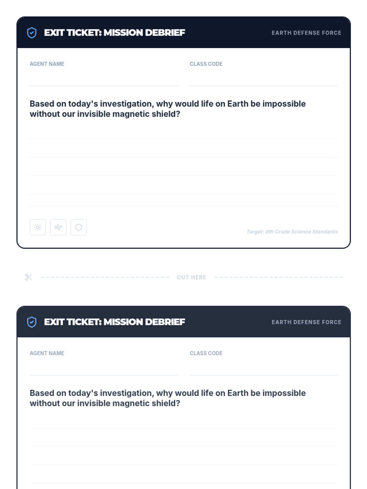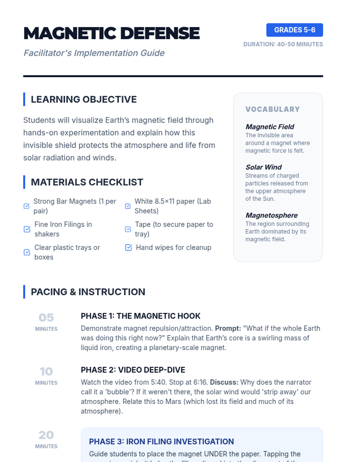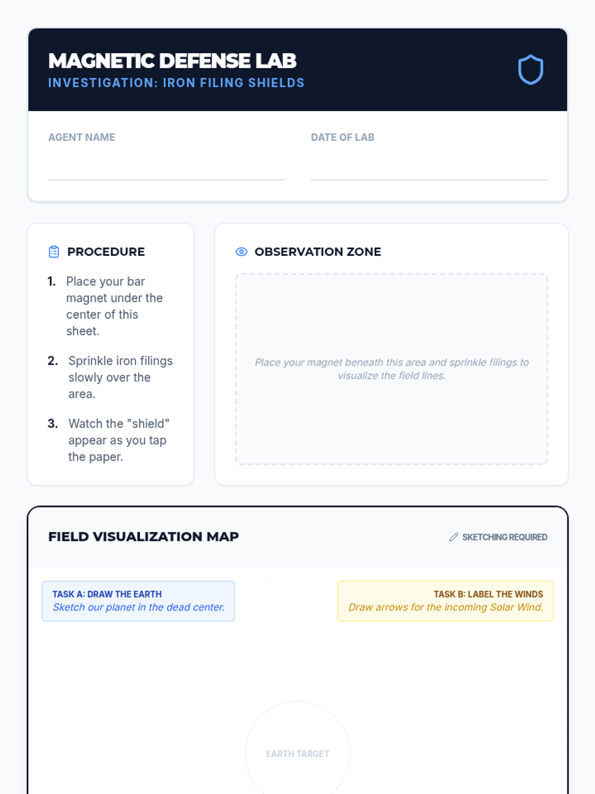A hands-on science lesson where students explore Earth's magnetic field using bar magnets and iron filings to understand how it protects our planet from solar winds.