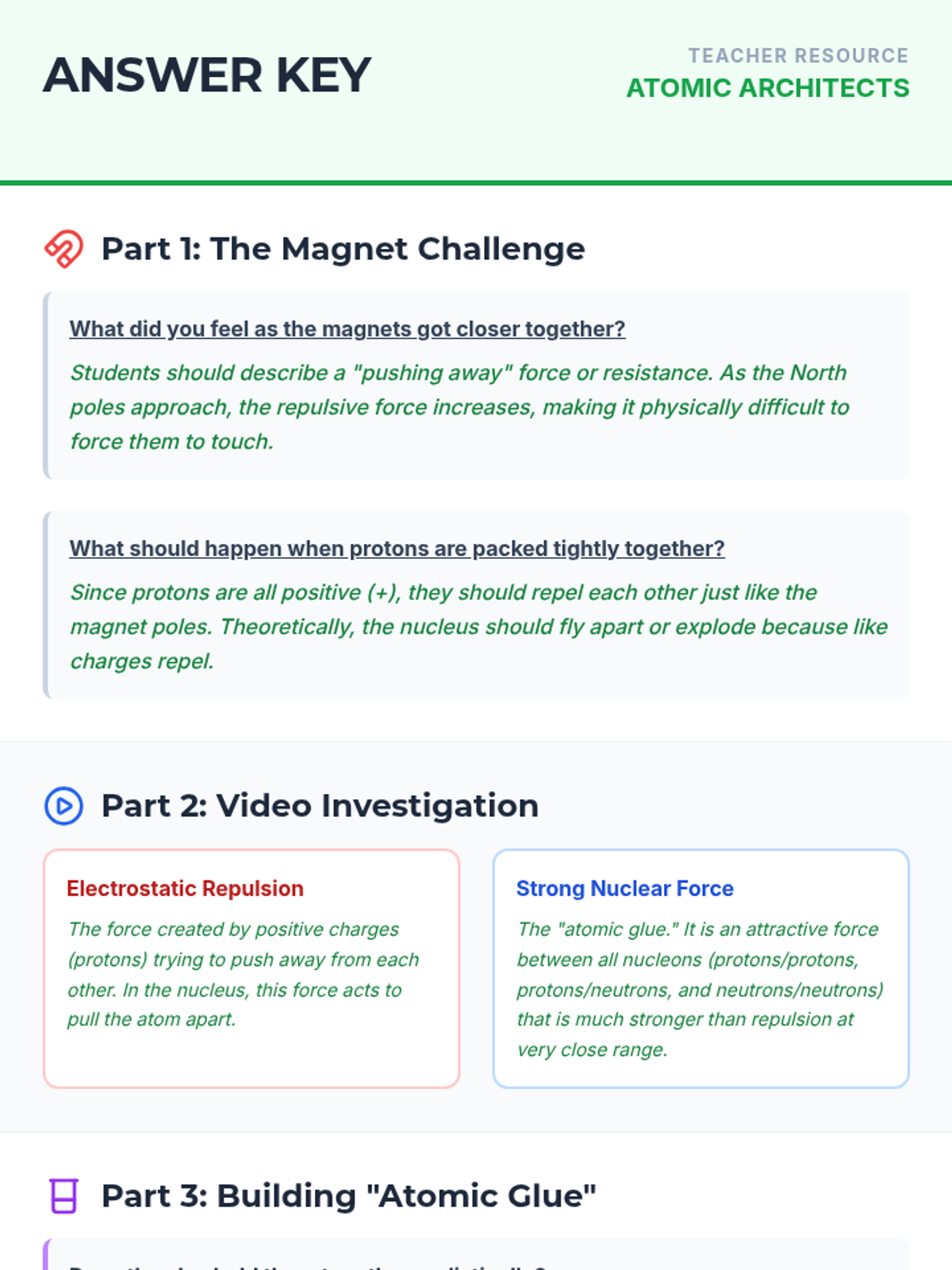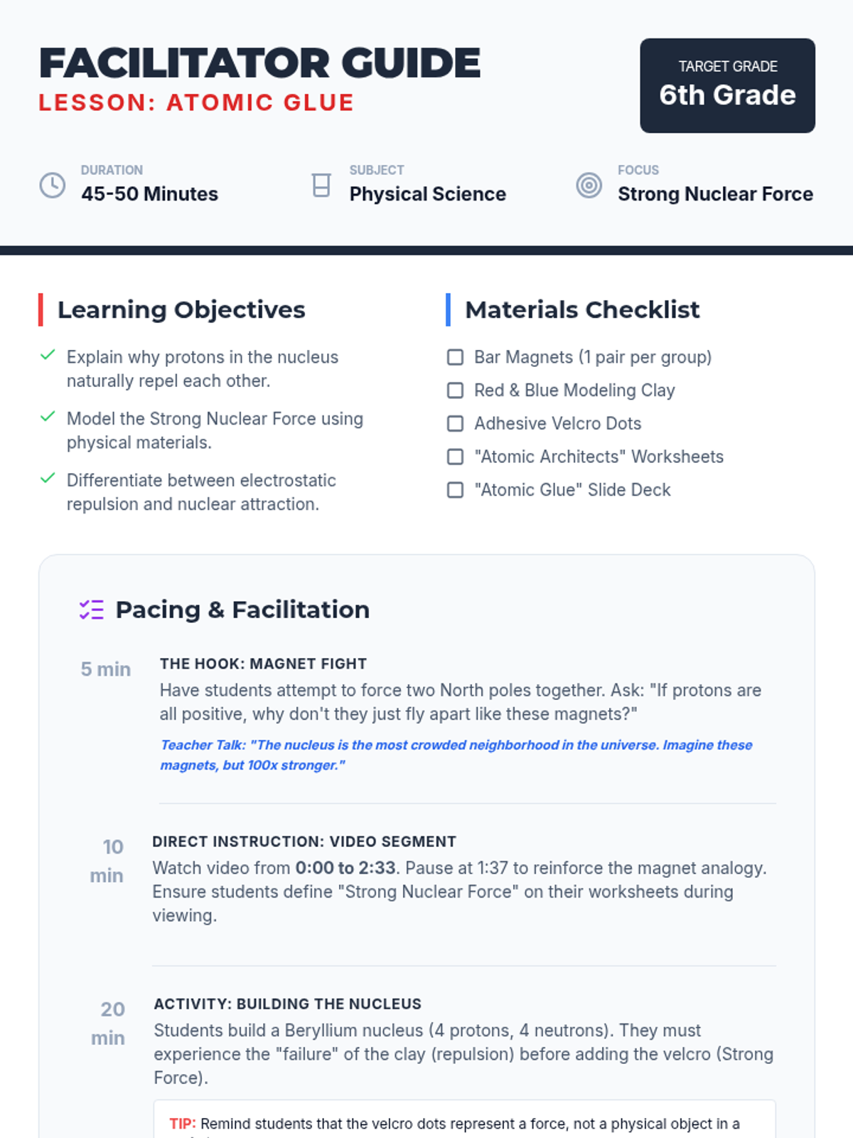 Students explore the internal structure of the atom, focusing on why the nucleus stays together despite electrostatic repulsion. This lesson uses magnets, modeling clay, and velcro to simulate the Strong Nuclear Force and includes a video-based investigation into nuclear physics basics.