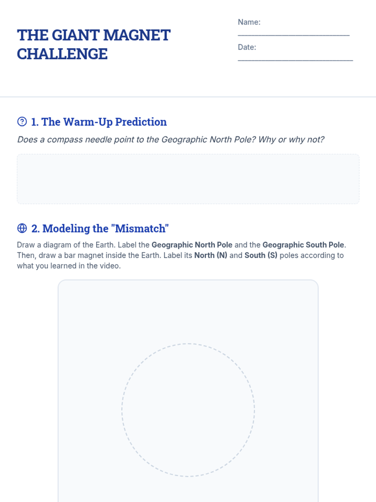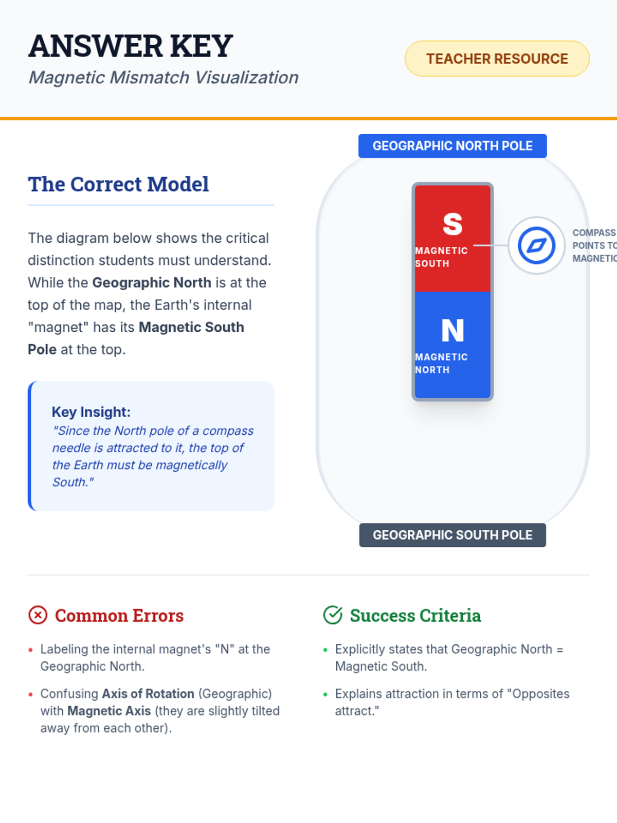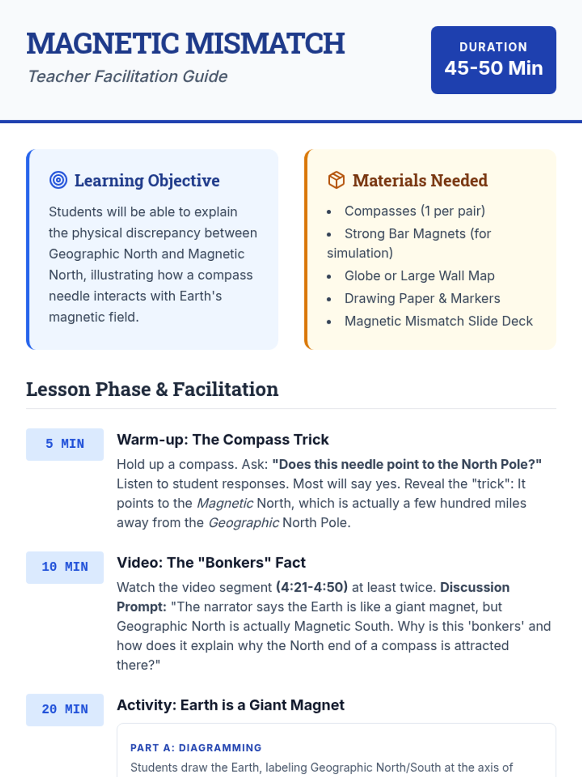 A comprehensive lesson exploring the discrepancy between Earth's geographic and magnetic poles, featuring a video-based discussion and a hands-on navigation simulation.