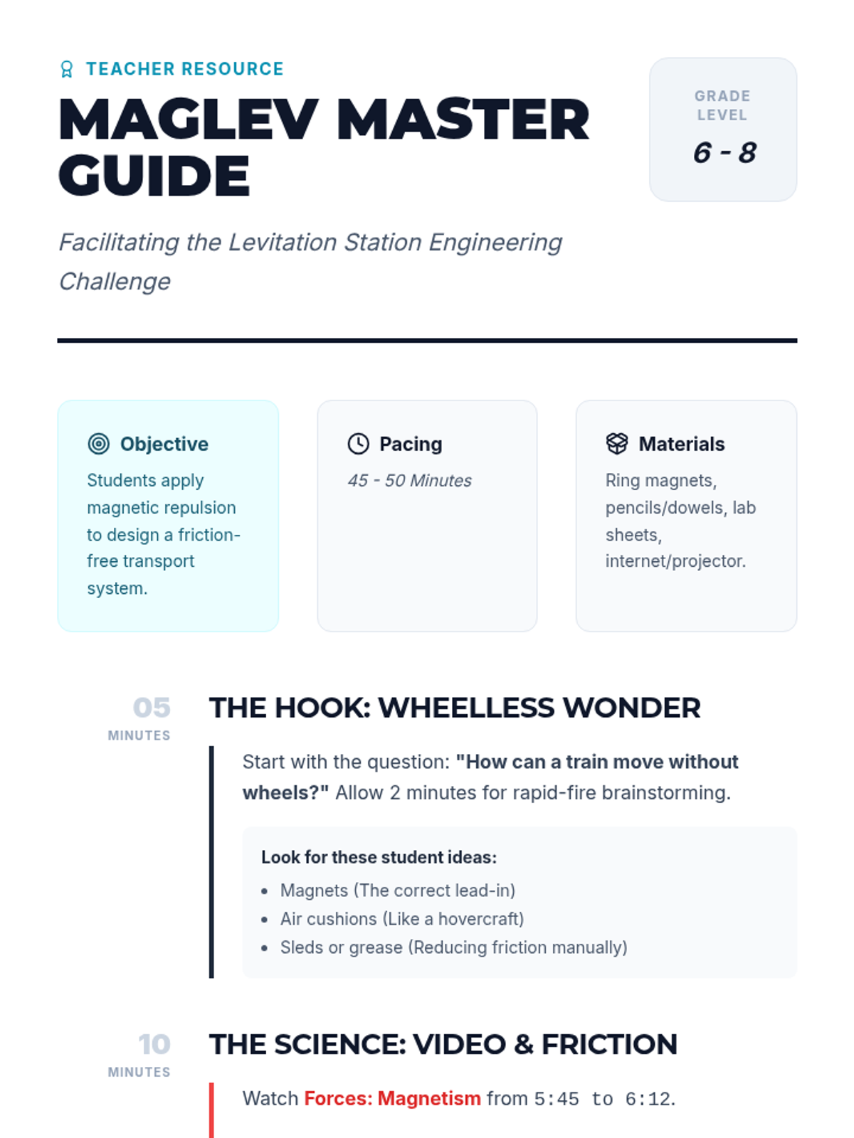 A hands-on engineering lesson where students explore magnetic repulsion and design a friction-free transport system inspired by Maglev technology.