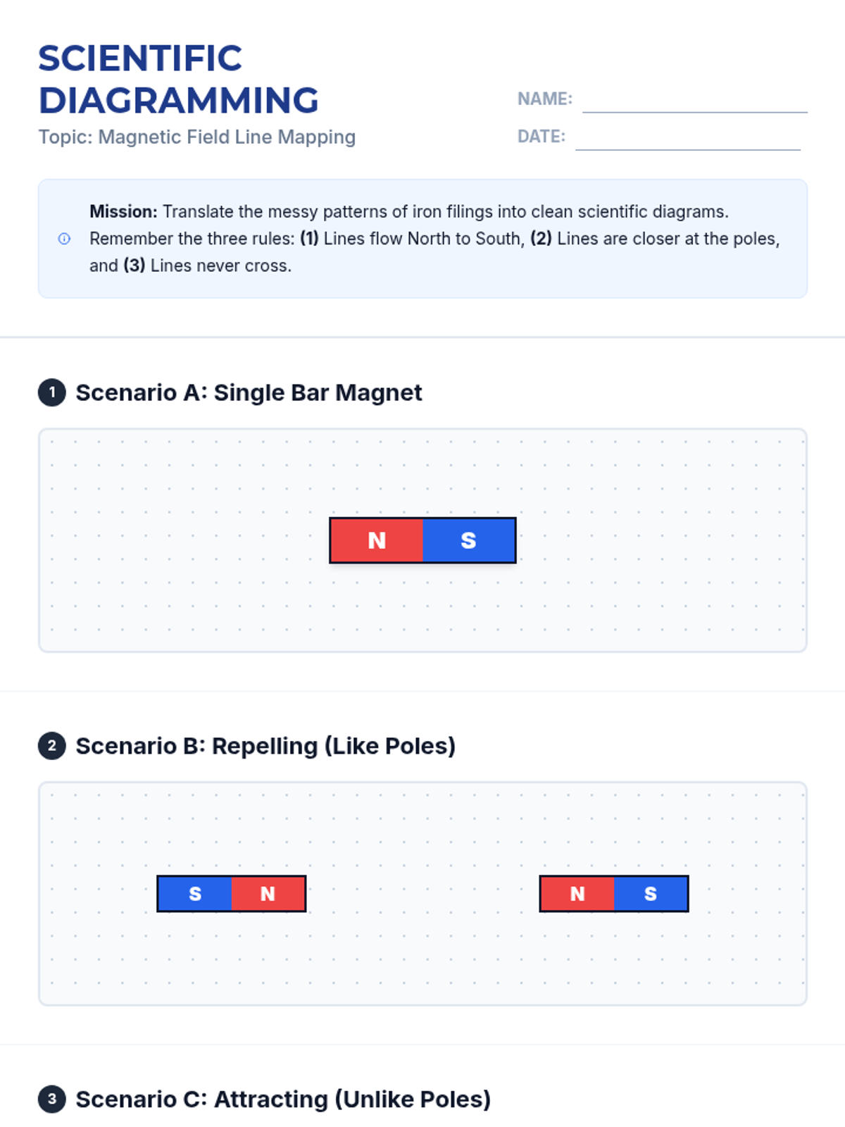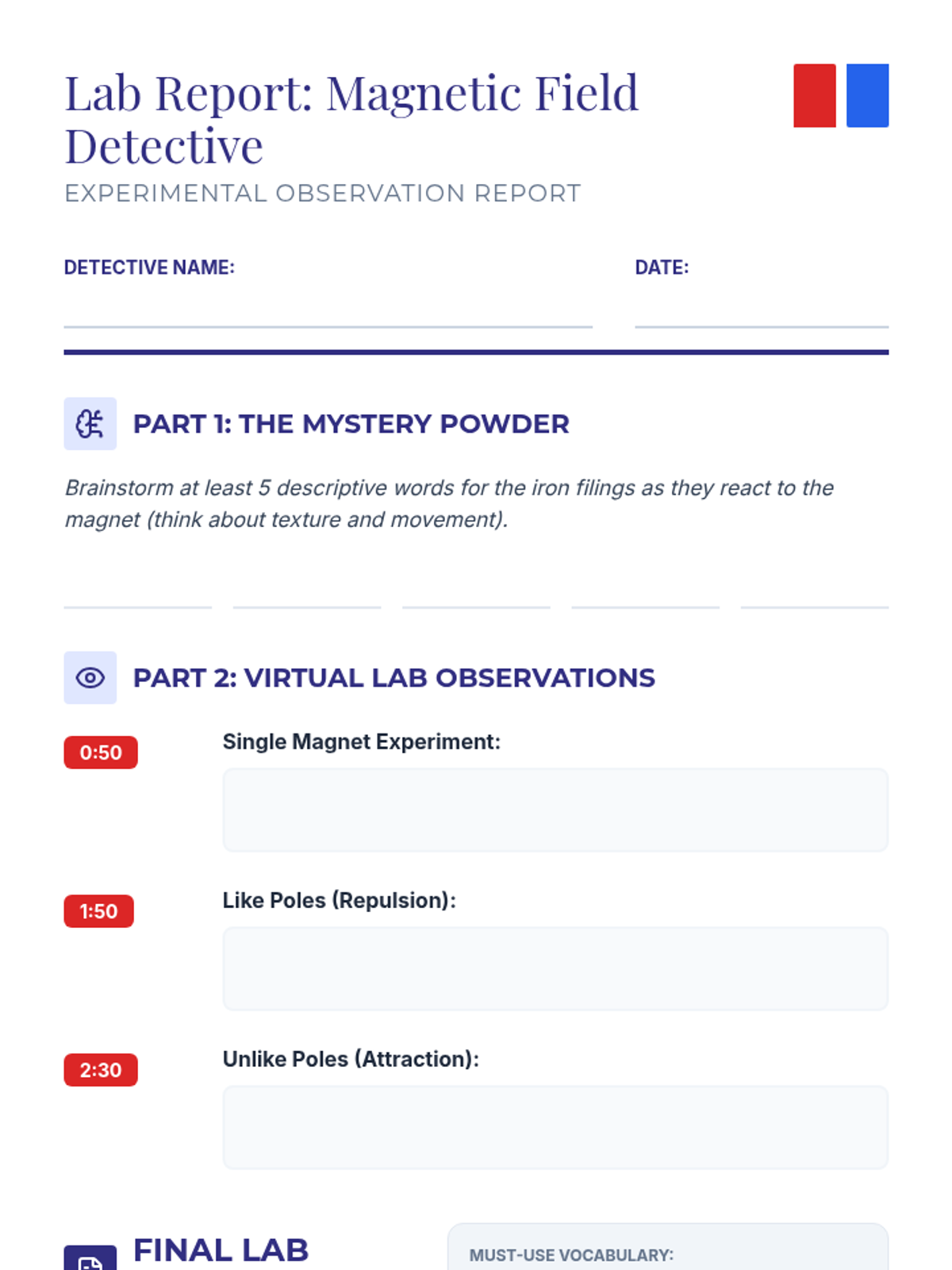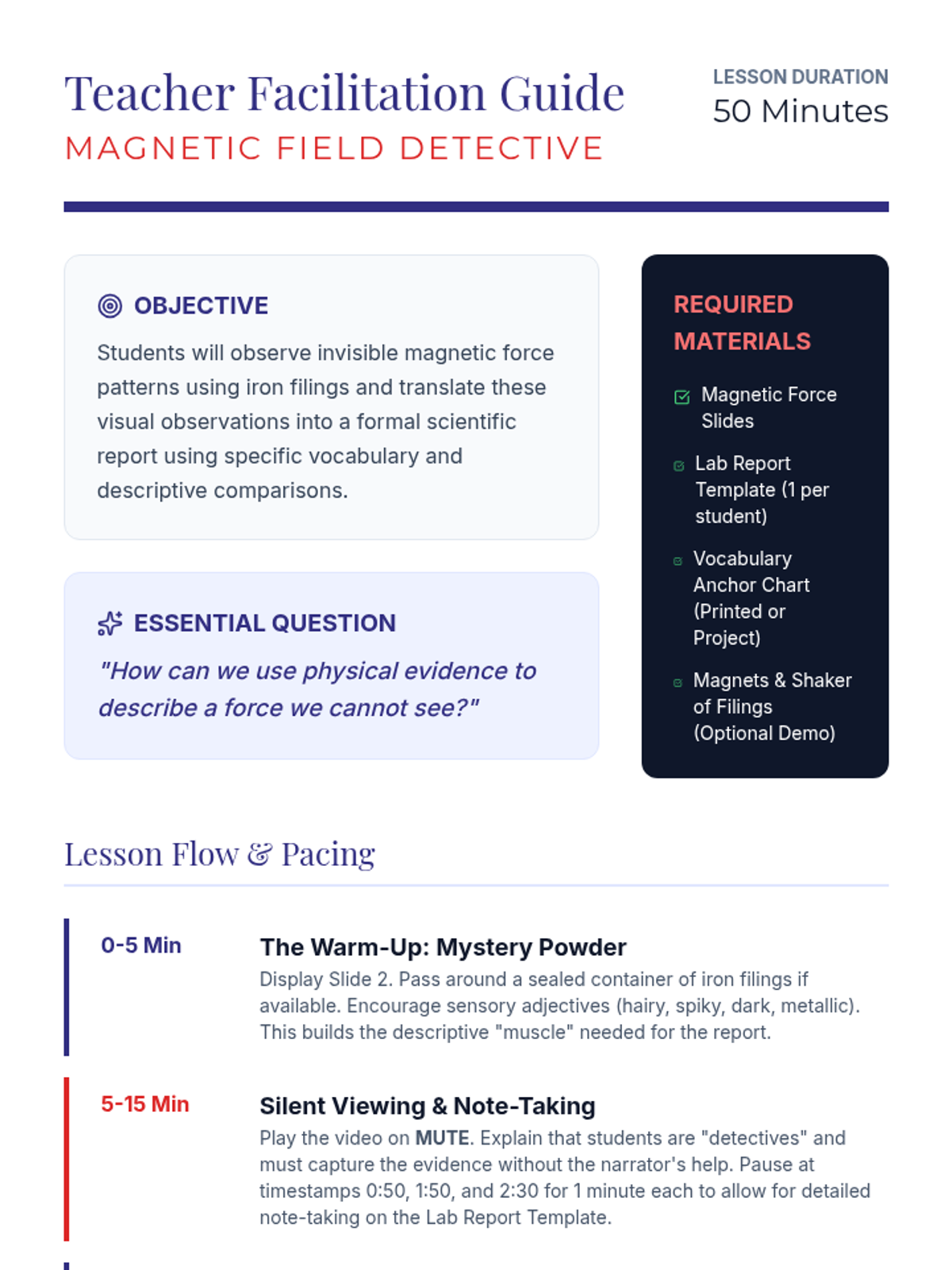 Students observe and document magnetic field patterns using iron filings. They will watch a silent video experiment, take detailed notes, and write a descriptive scientific report using key vocabulary like Magnetic Field, Poles, Repel, and Attract.