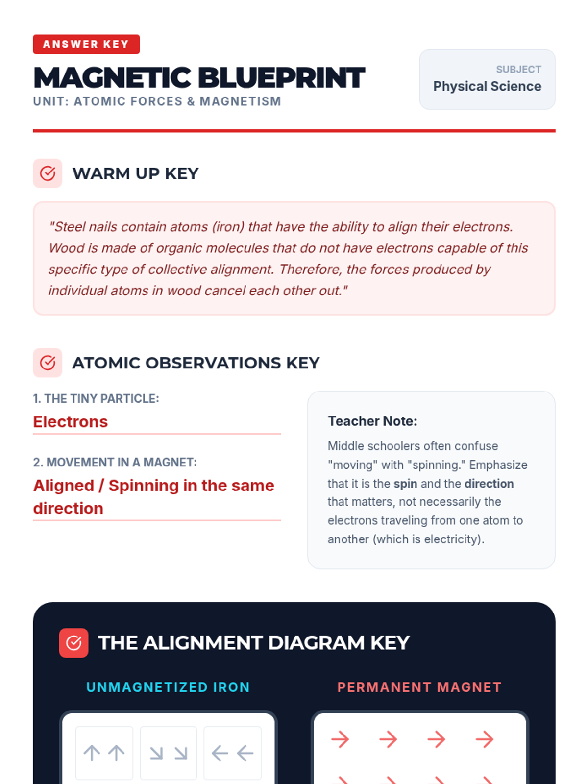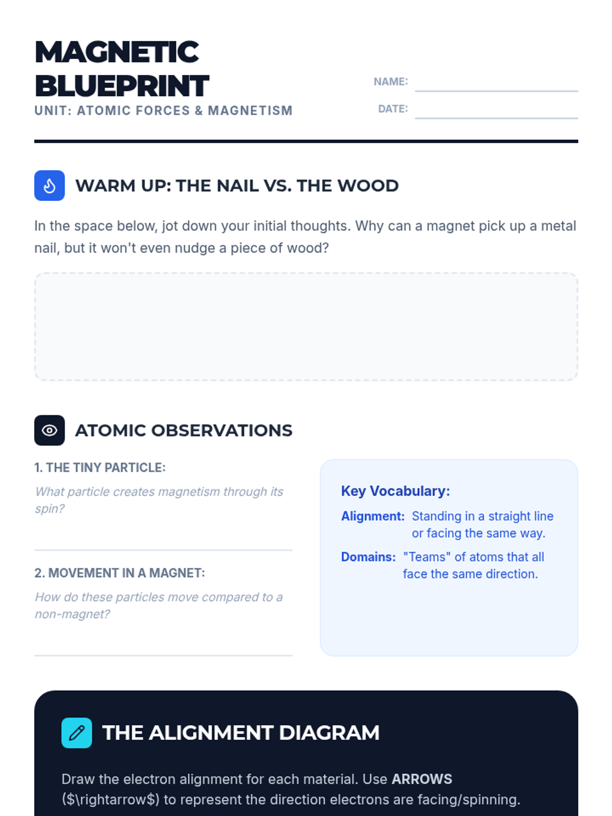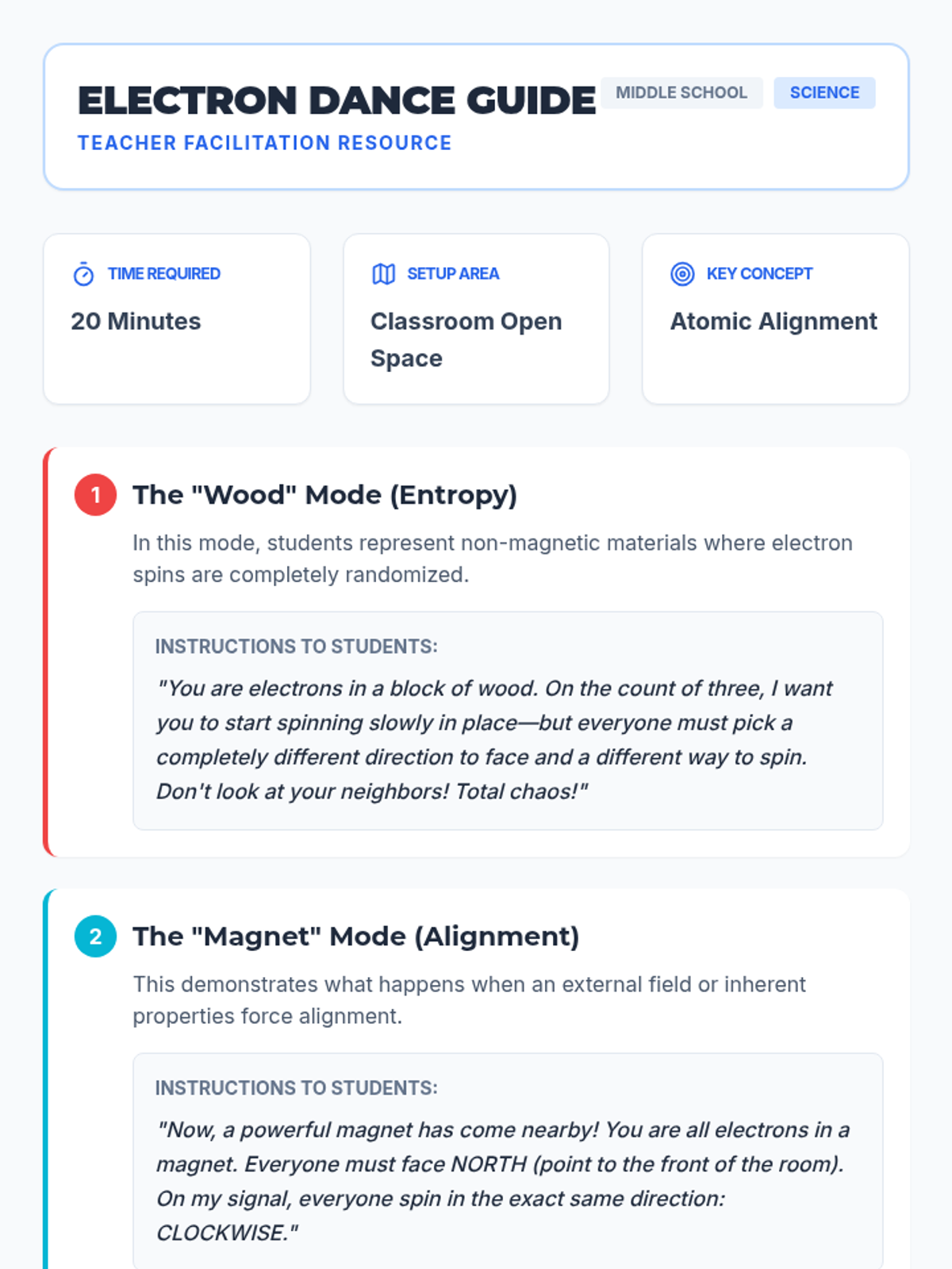 Students explore the atomic basis of magnetism by modeling electron alignment through a movement-based activity called 'The Electron Dance' and creating visual diagrams of magnetic domains.