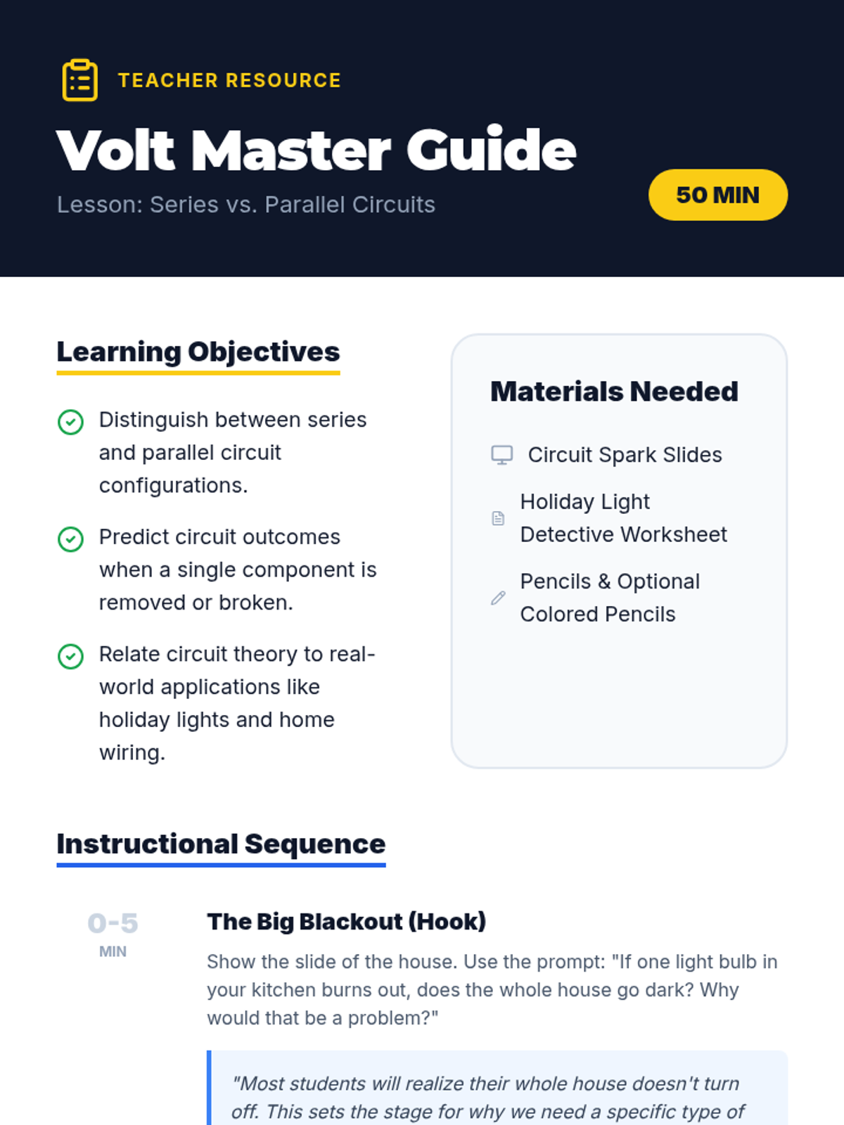 Students will transition from understanding simple circuits to designing a parallel circuit system for a 3-room house model. The lesson uses a video hook to demonstrate the constant brightness of parallel loads and challenges students to apply this 'Architect of Light' mindset to floor plan wiring.