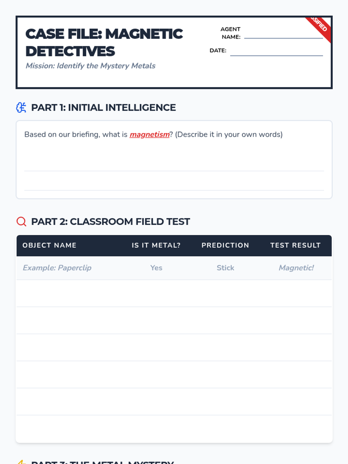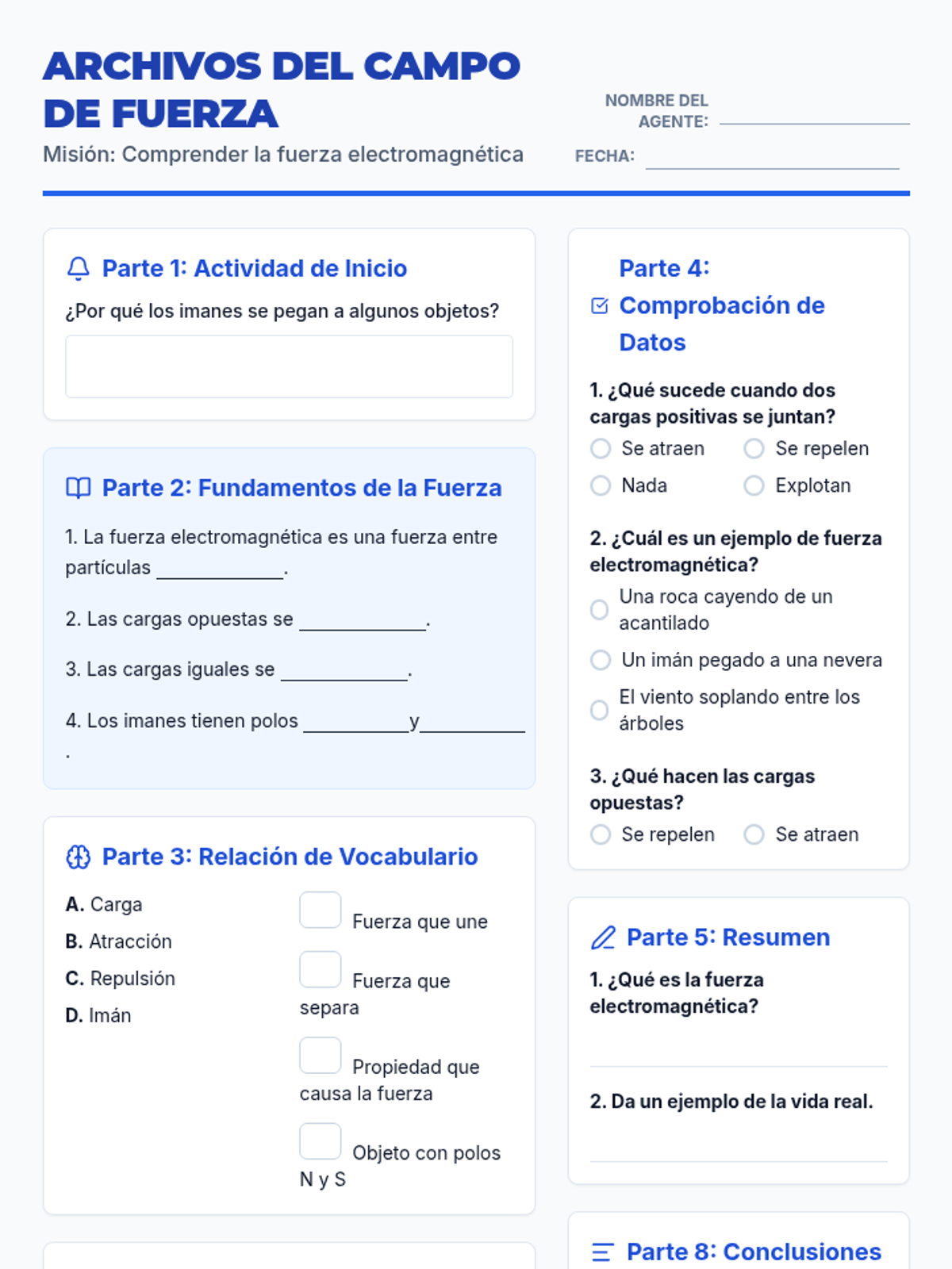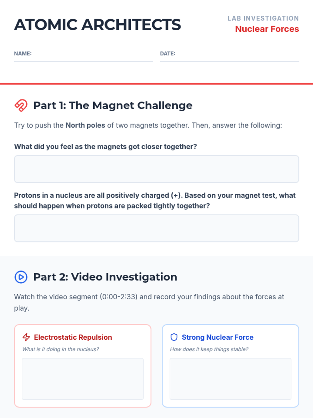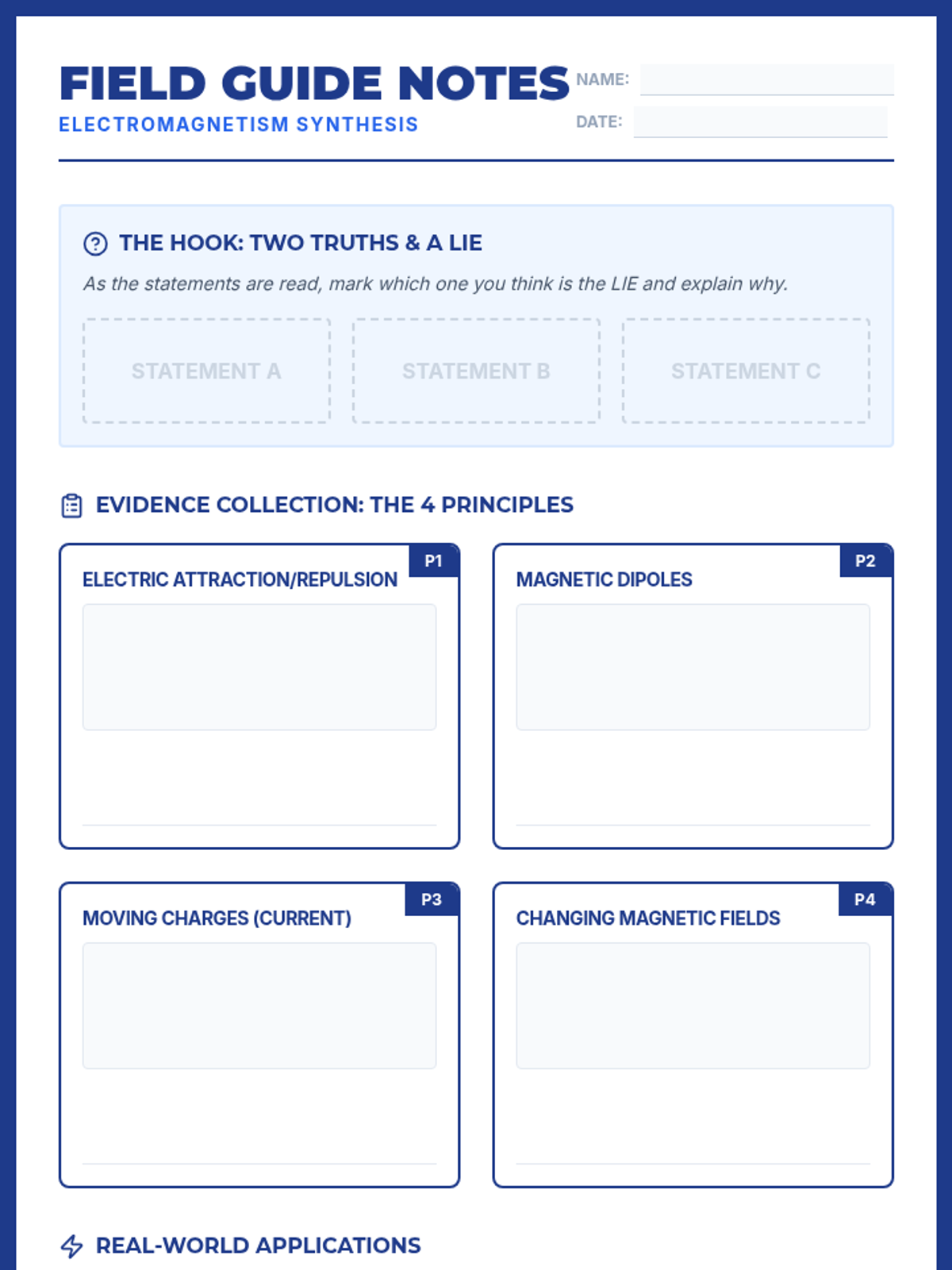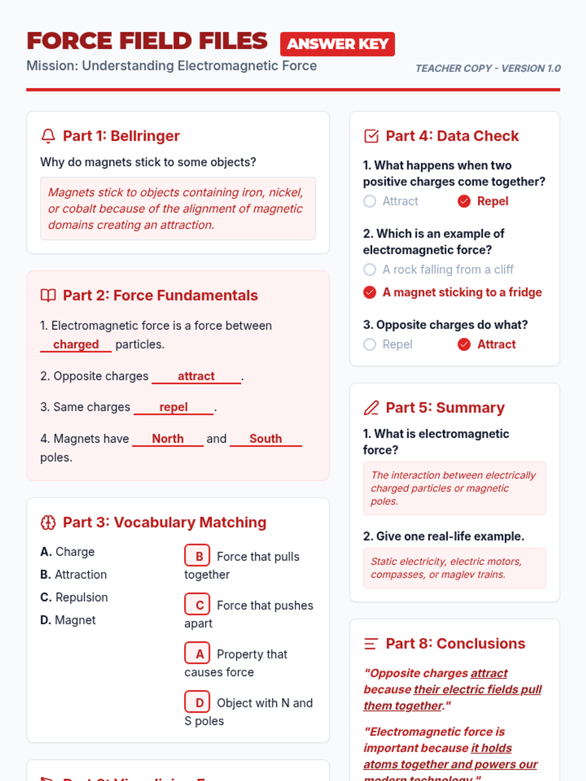 A foundational introduction to electromagnetic forces, covering charges, magnetic poles, and real-world applications through a structured guided notes and practice handout.