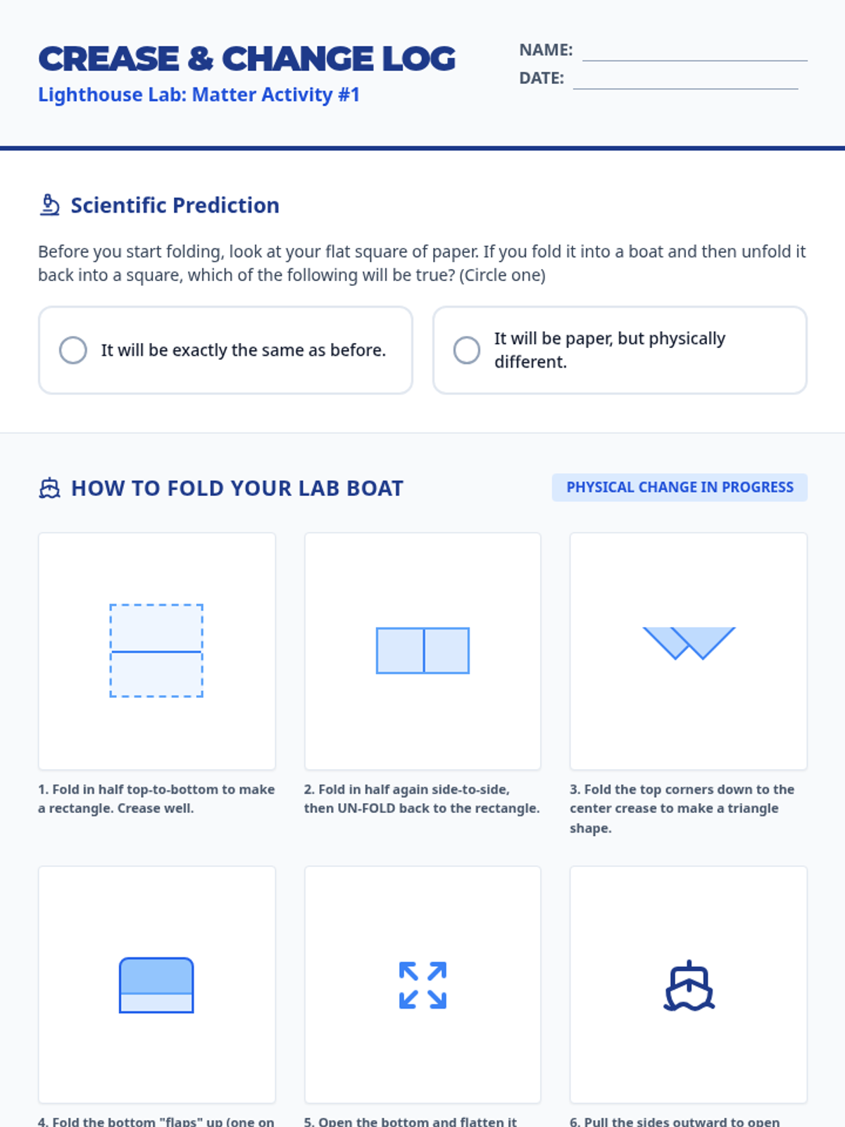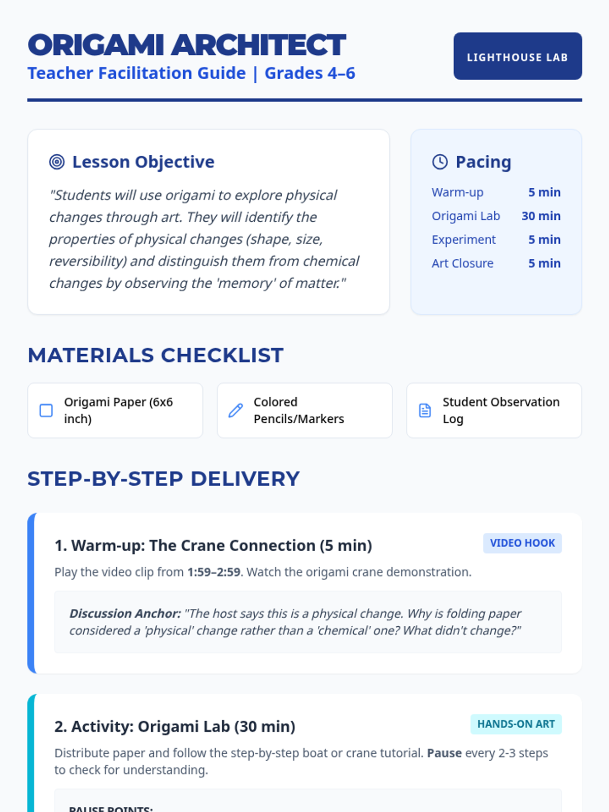 A 4th-6th grade arts integration lesson where students explore physical changes in matter through the art of origami, using the 'Lighthouse Lab' video as a scientific foundation.