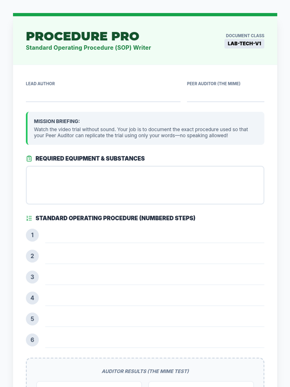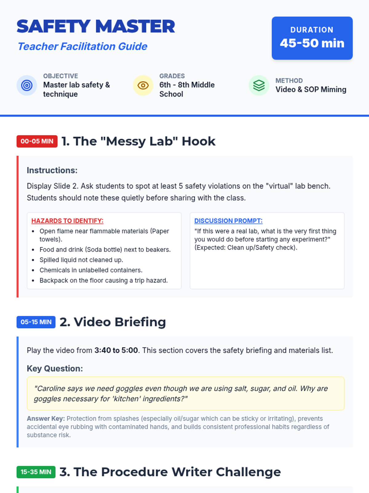 Students will learn essential laboratory safety protocols and the importance of clear procedural communication through a video-based 'Procedure Writer' activity. They will identify hazards, analyze safety gear requirements, and practice writing precise Standard Operating Procedures (SOPs).