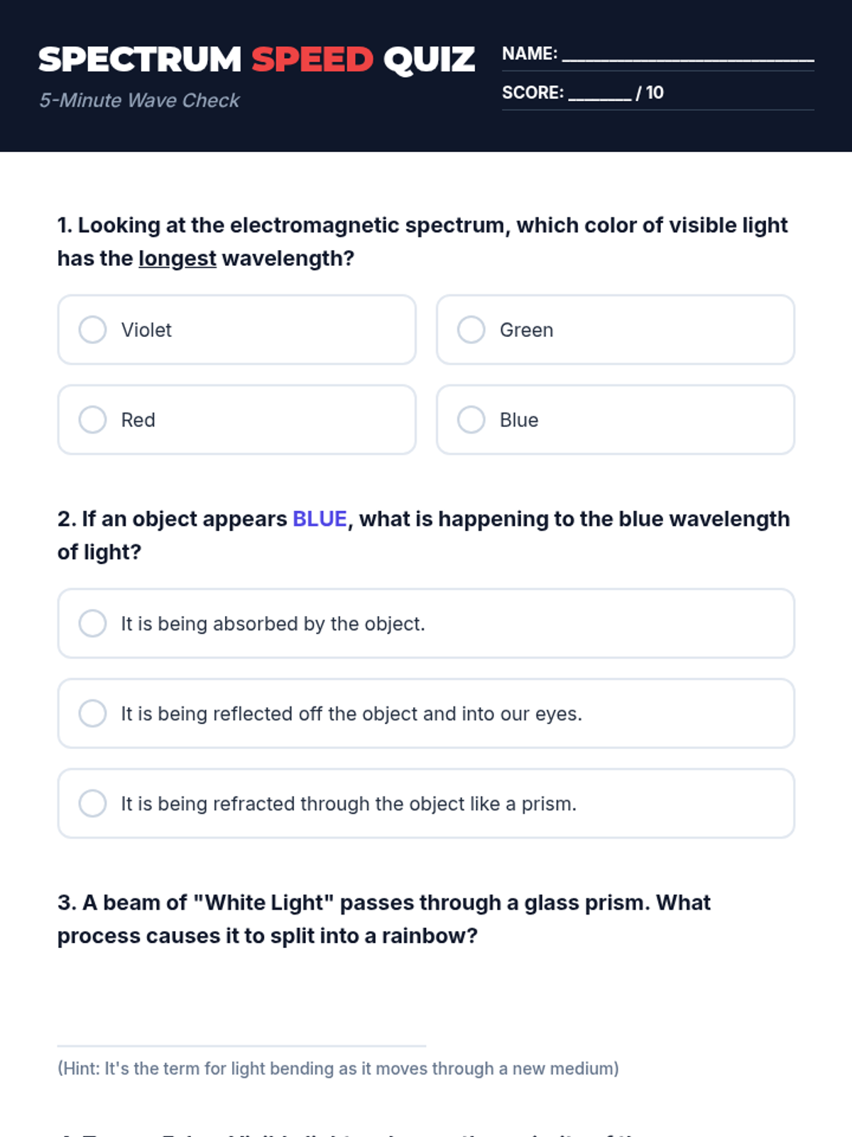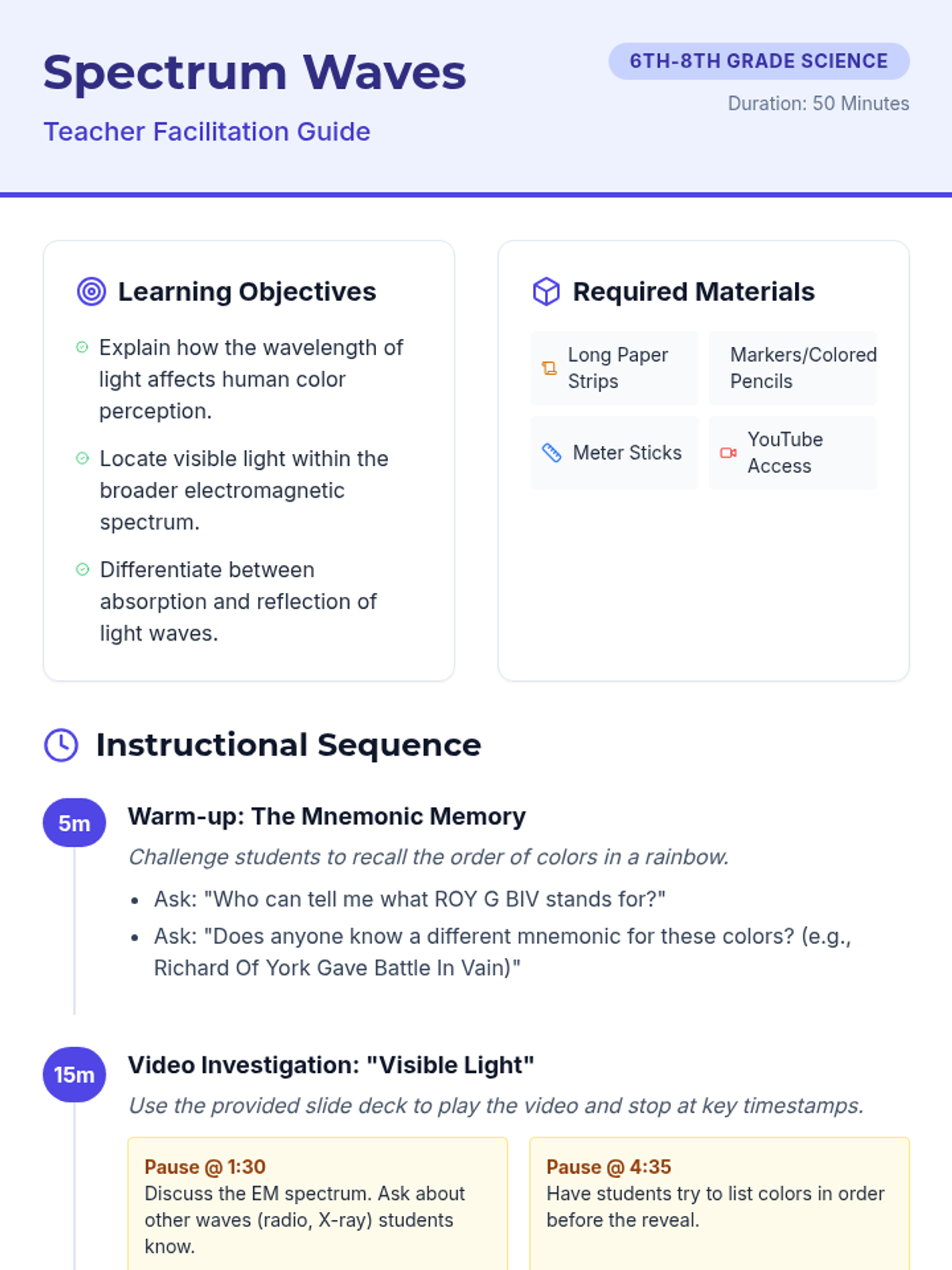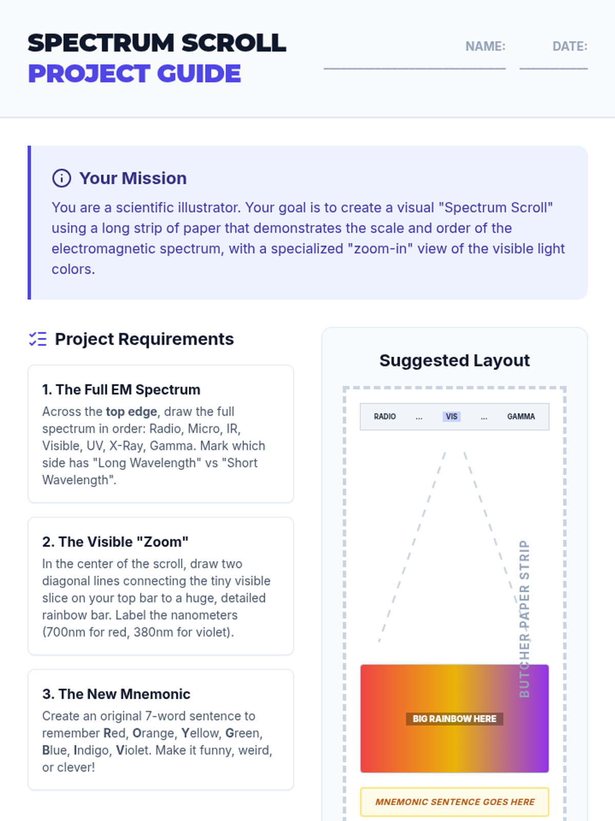 Students explore the electromagnetic spectrum with a focus on visible light. They learn how wavelength determines color, understand the mechanics of absorption and reflection, and create a 'Spectrum Scroll' featuring a custom mnemonic for the color sequence.