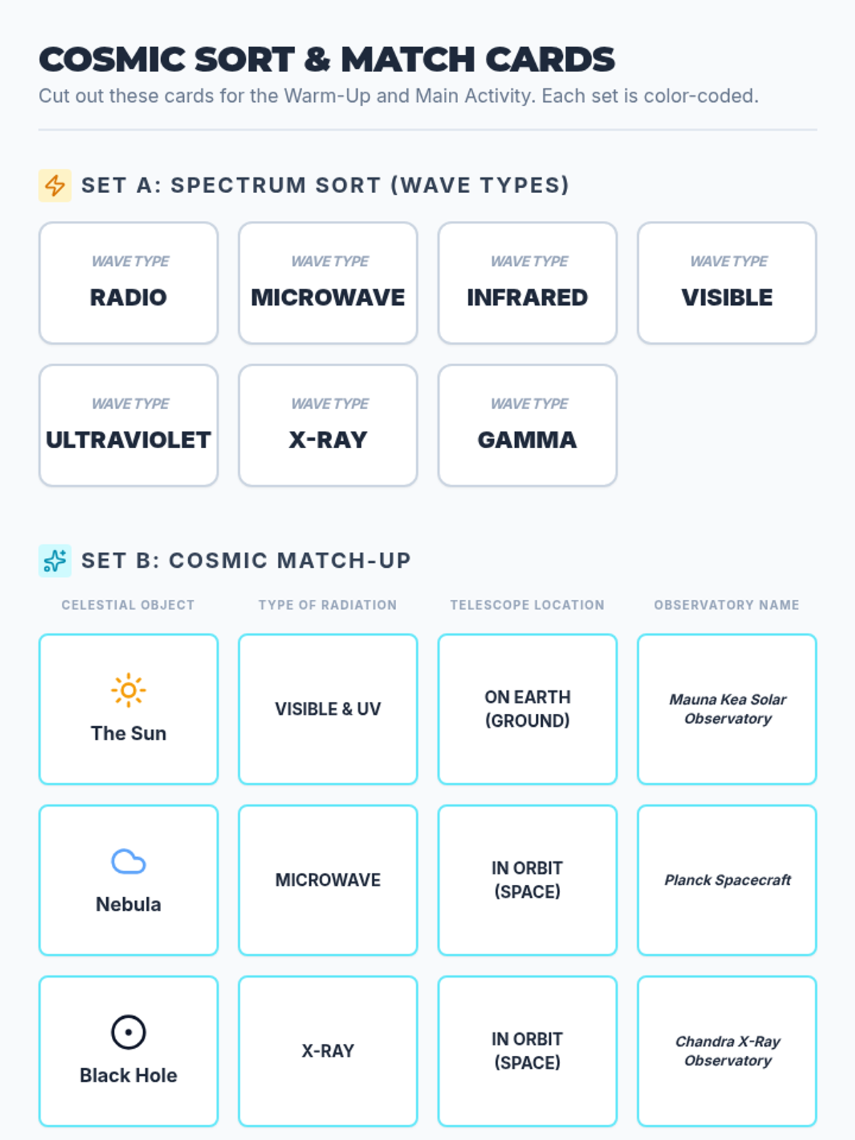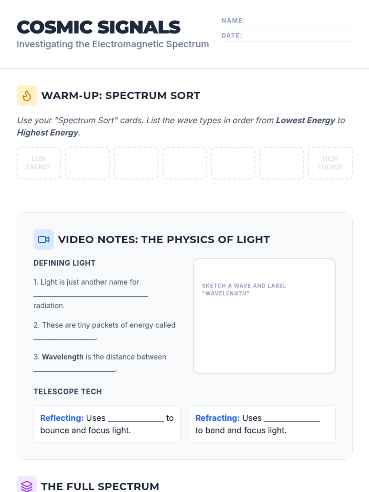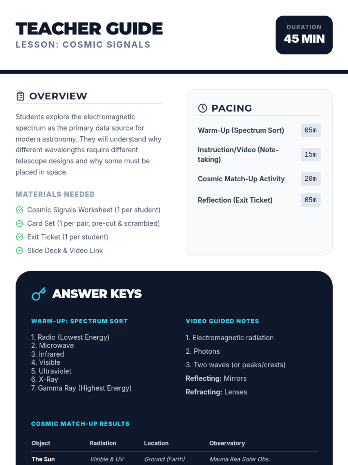 A comprehensive lesson exploring the electromagnetic spectrum, how astronomers use different wavelengths to study space, and the specific tools required to detect cosmic radiation. Students will engage in hands-on sorting and matching activities while watching a guided video presentation.