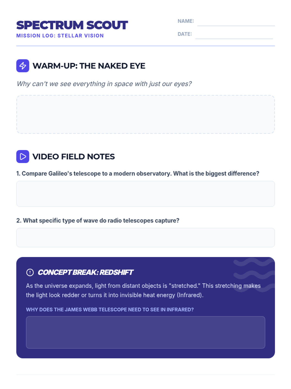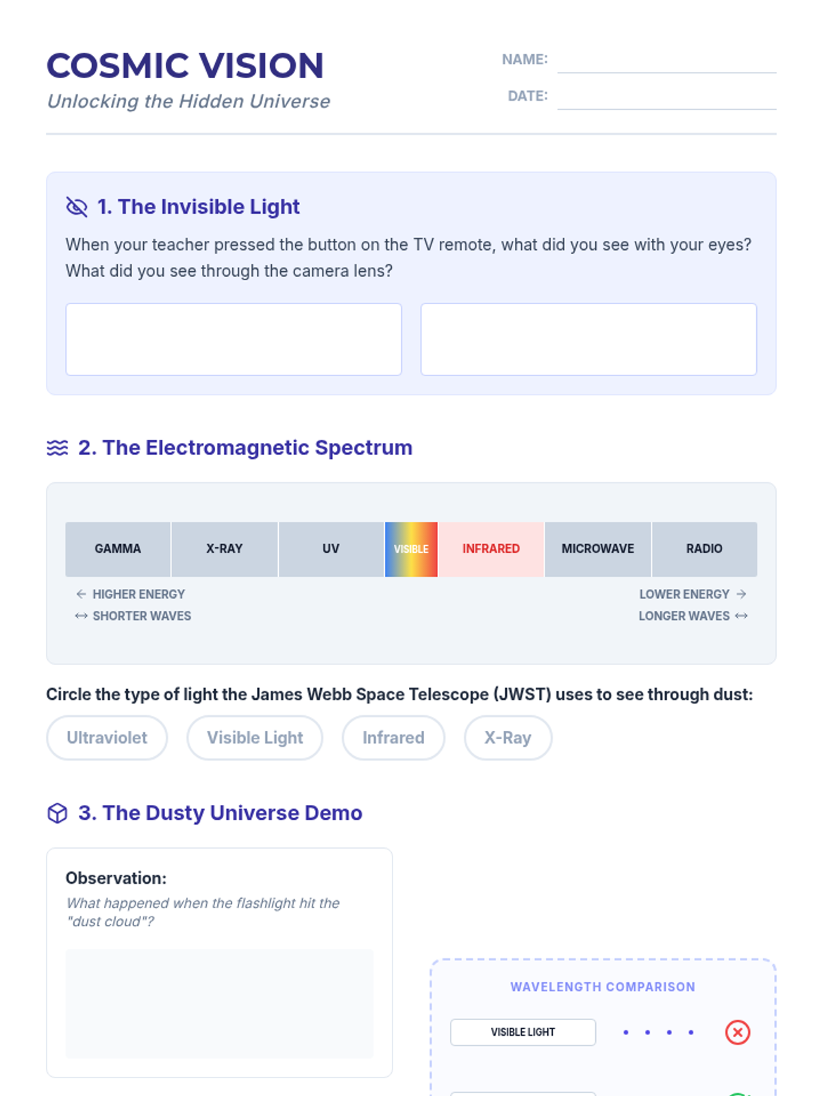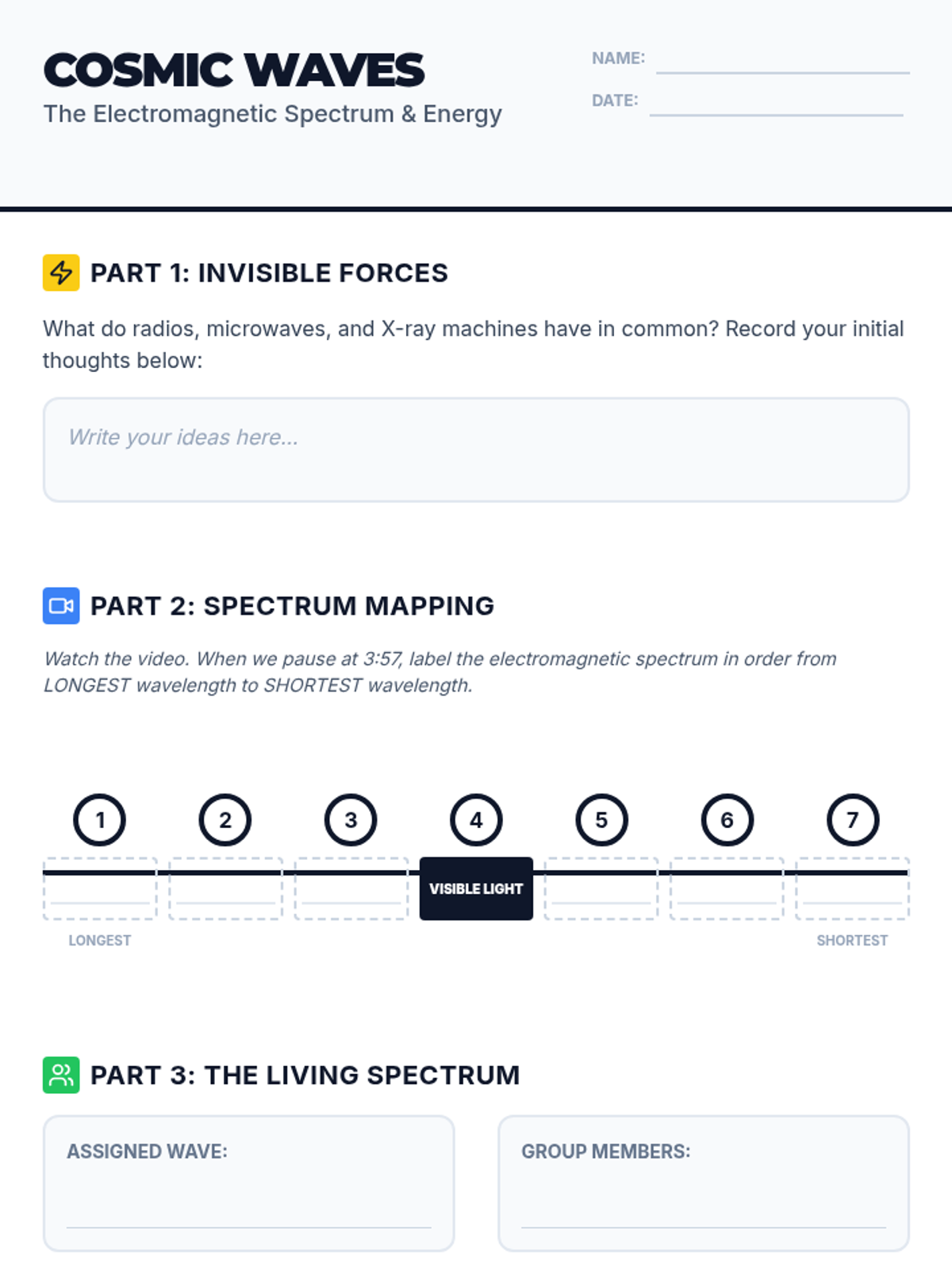 A comprehensive lesson exploring the electromagnetic spectrum, how astronomers use different wavelengths to study space, and the specific tools required to detect cosmic radiation. Students will engage in hands-on sorting and matching activities while watching a guided video presentation.