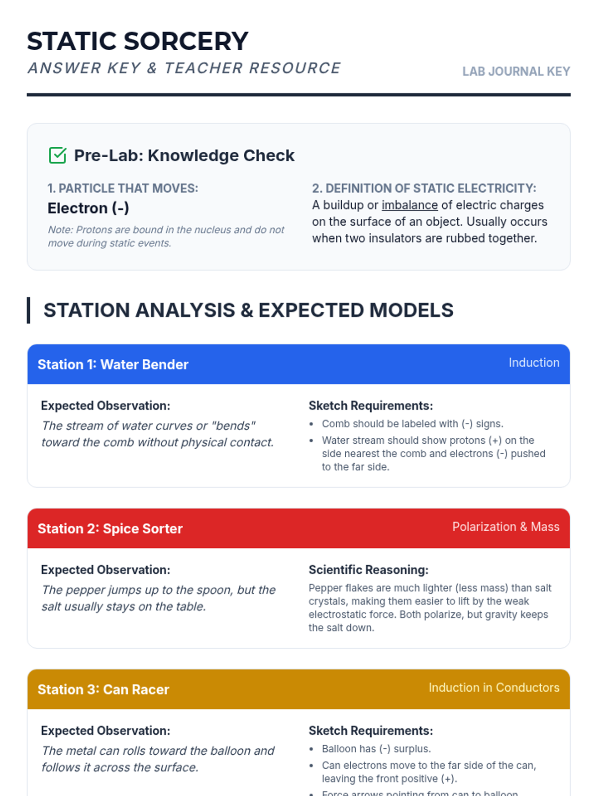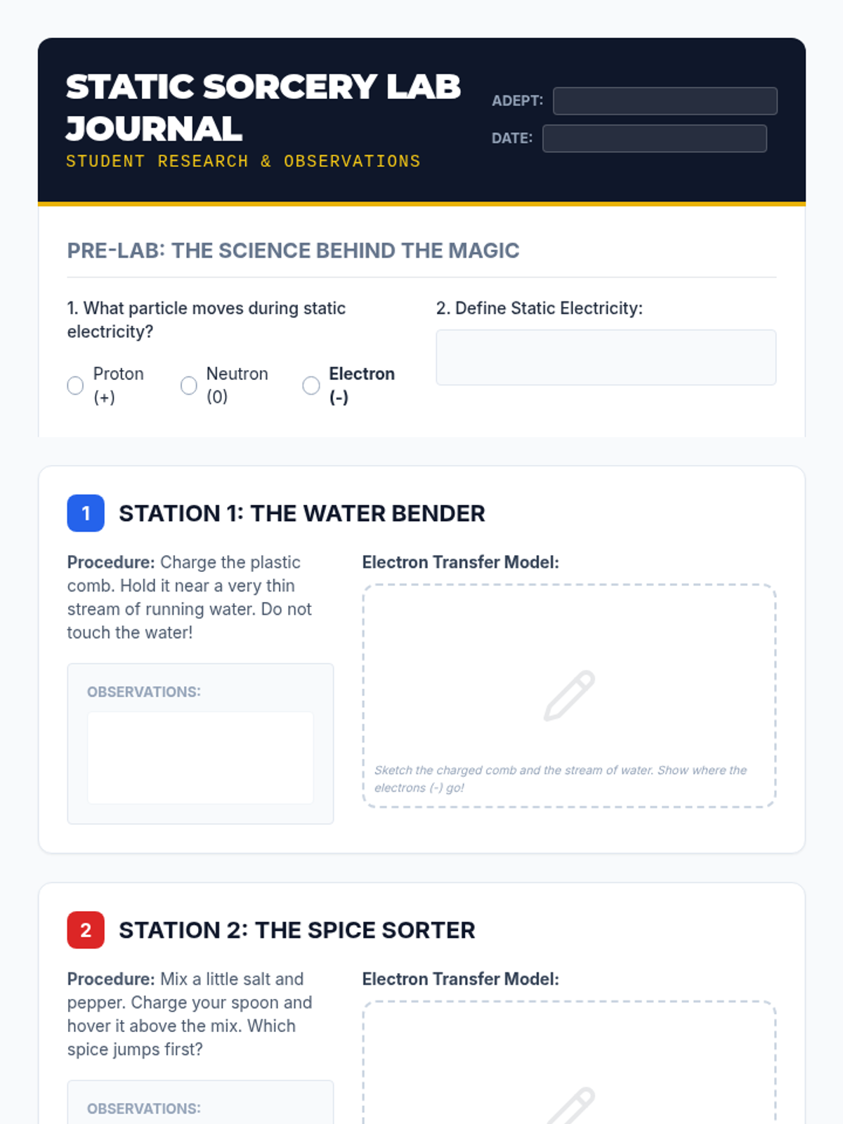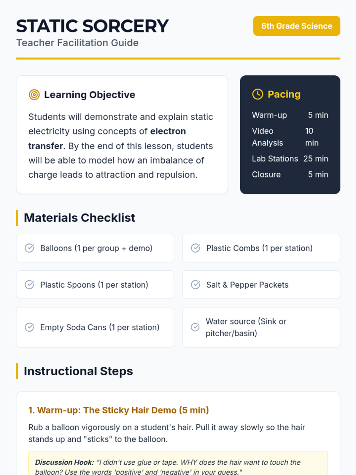 A 6th-grade science lesson on static electricity where students explore electron transfer through 'Static Sorcery' stations. Students will visualize how negative charges move to create imbalances that result in attraction and repulsion.