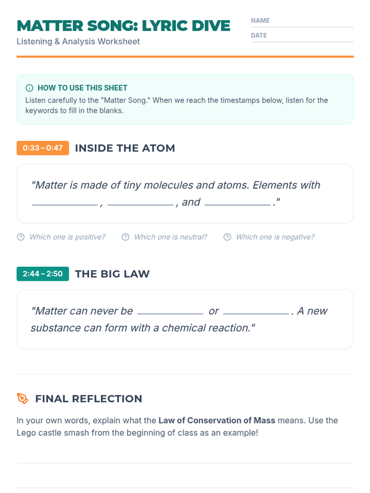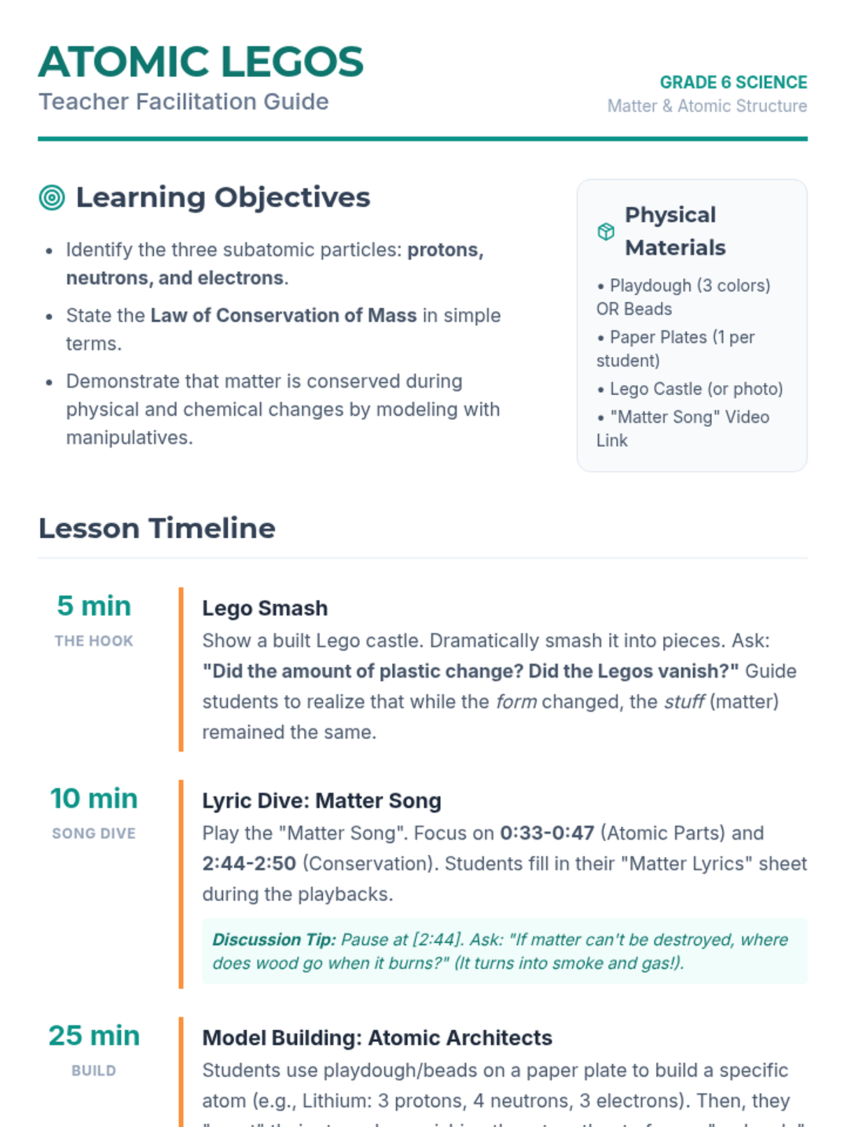 Students explore the conservation of mass and chemical reactions through a LEGO-based analogy, verifying that atoms are never created or destroyed, only rearranged. The lesson includes a video analysis, a hands-on building activity, and a reflection on chemical vs. nuclear reactions.