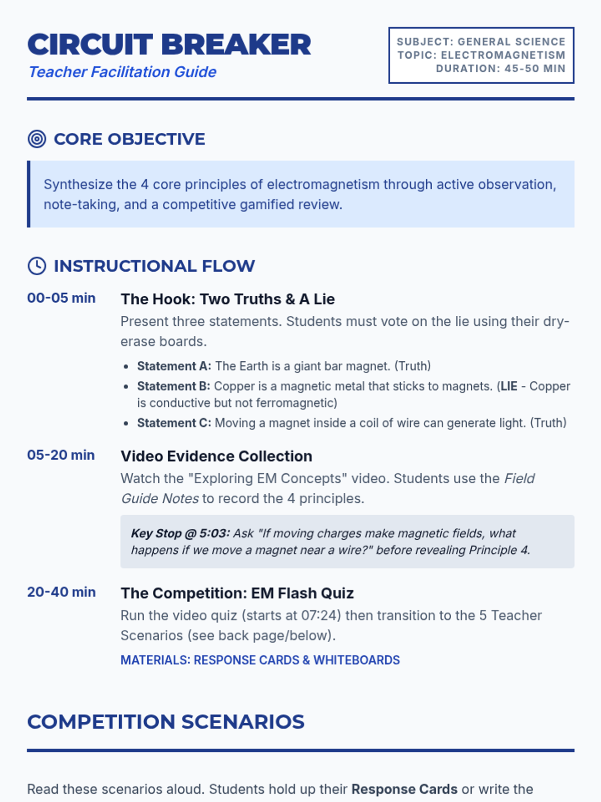 A gamified introductory lesson on electromagnetism where students synthesize four core principles using video evidence and a competitive scenario-based quiz. Students explore the historical context of James Maxwell and real-world applications from Earth's magnetosphere to audio technology.