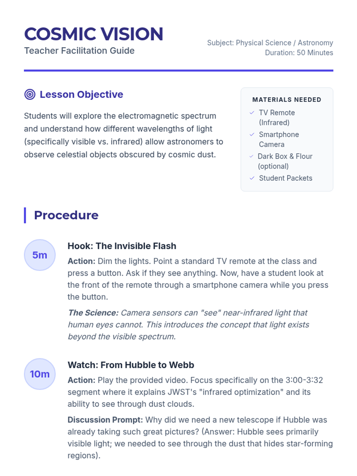 A middle school science lesson exploring the electromagnetic spectrum through the lens of the Hubble and James Webb Space Telescopes. Students investigate why different wavelengths of light reveal different secrets of the universe using hands-on demos and side-by-side image analysis.
