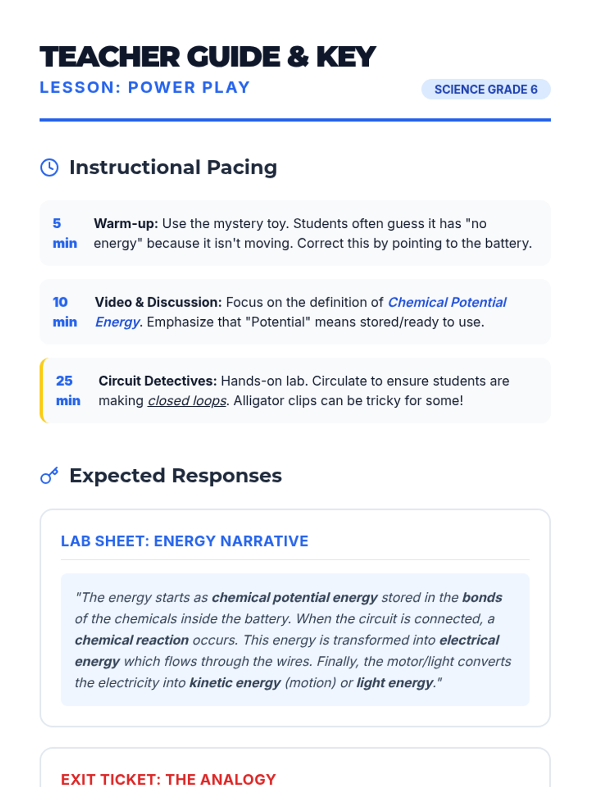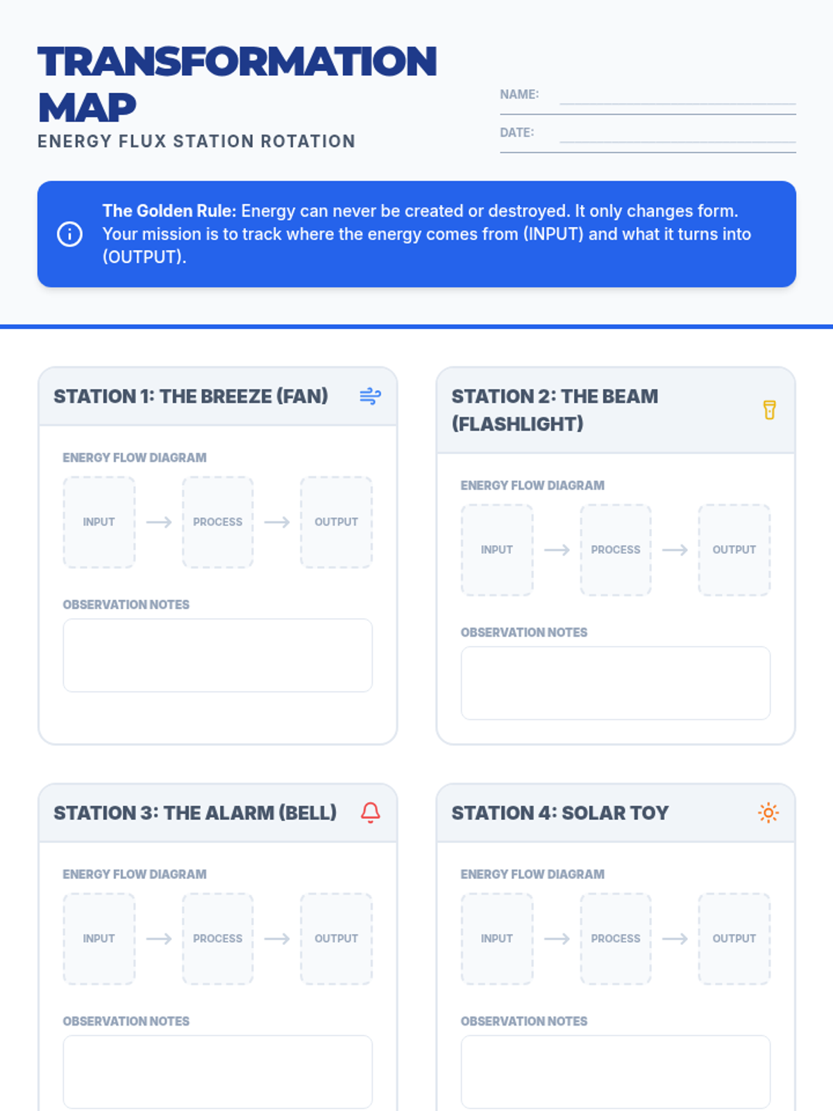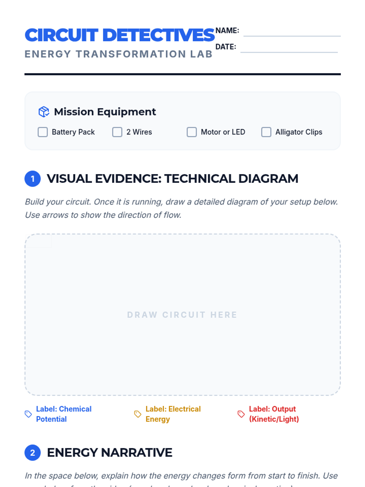 A hands-on exploration of energy transformations where students trace the flow of energy from chemical potential in batteries to electrical energy in wires and finally to kinetic or light energy in outputs.