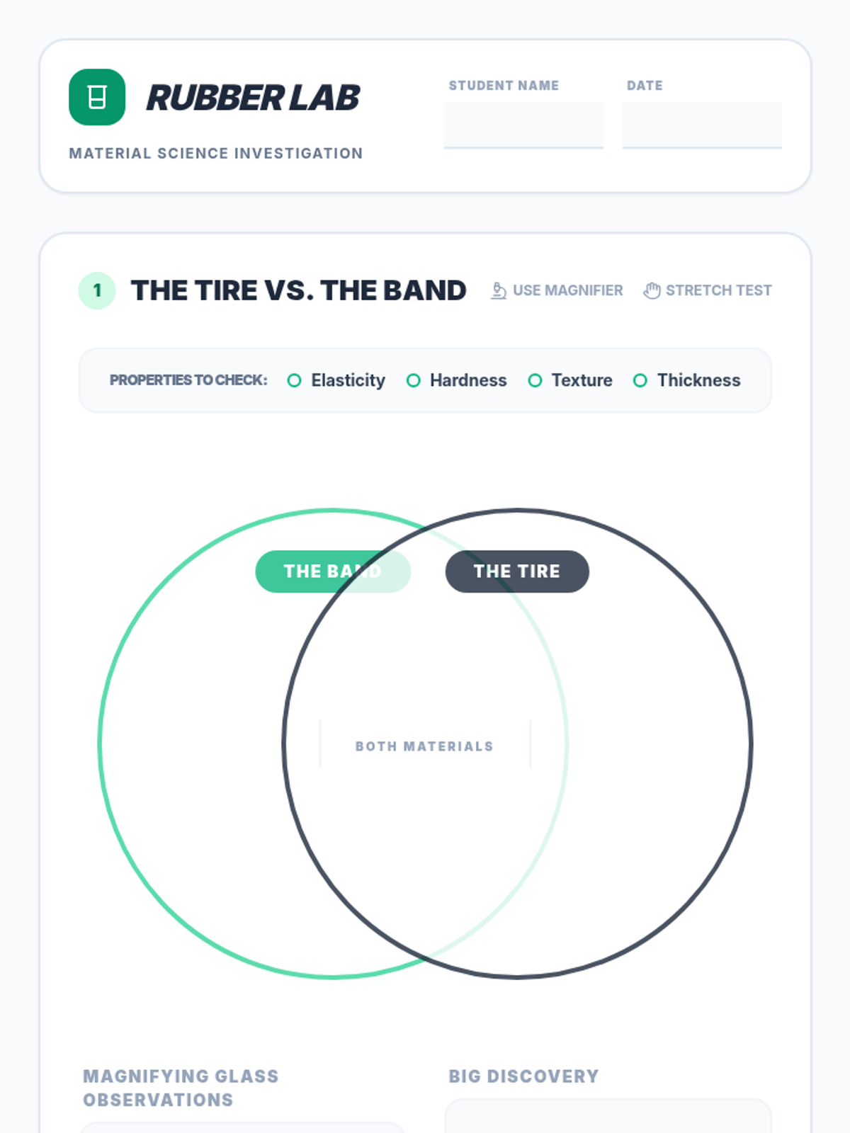 Students explore the world of materials science, testing various substances for conductivity, hardness, and flexibility to understand how properties dictate a material's use.