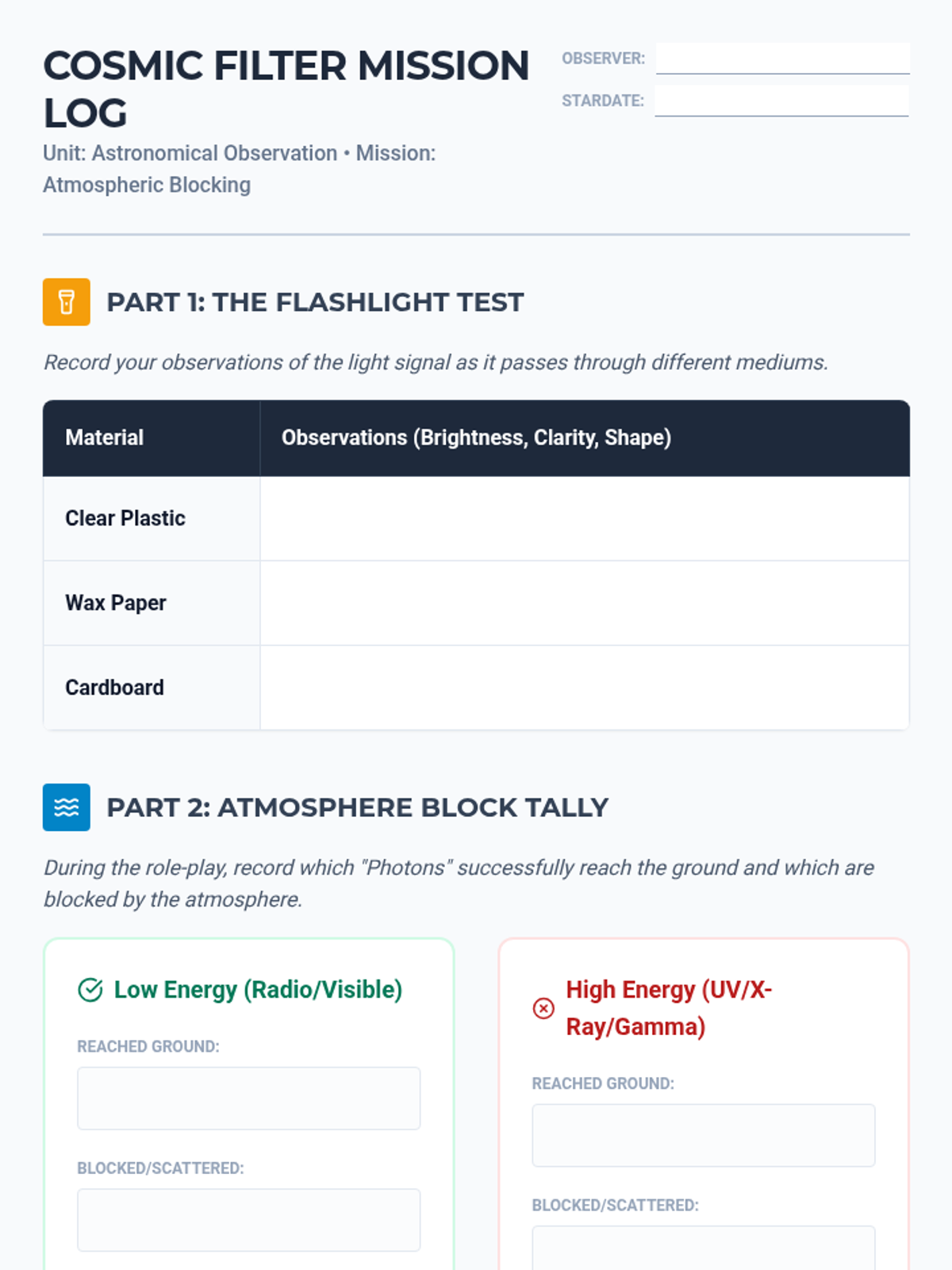 Explore the challenges of observing space through Earth's atmosphere. This lesson includes a hands-on light demonstration, a video exploration of the electromagnetic spectrum, and an interactive role-play activity where students act as the atmosphere blocking specific wavelengths of light.