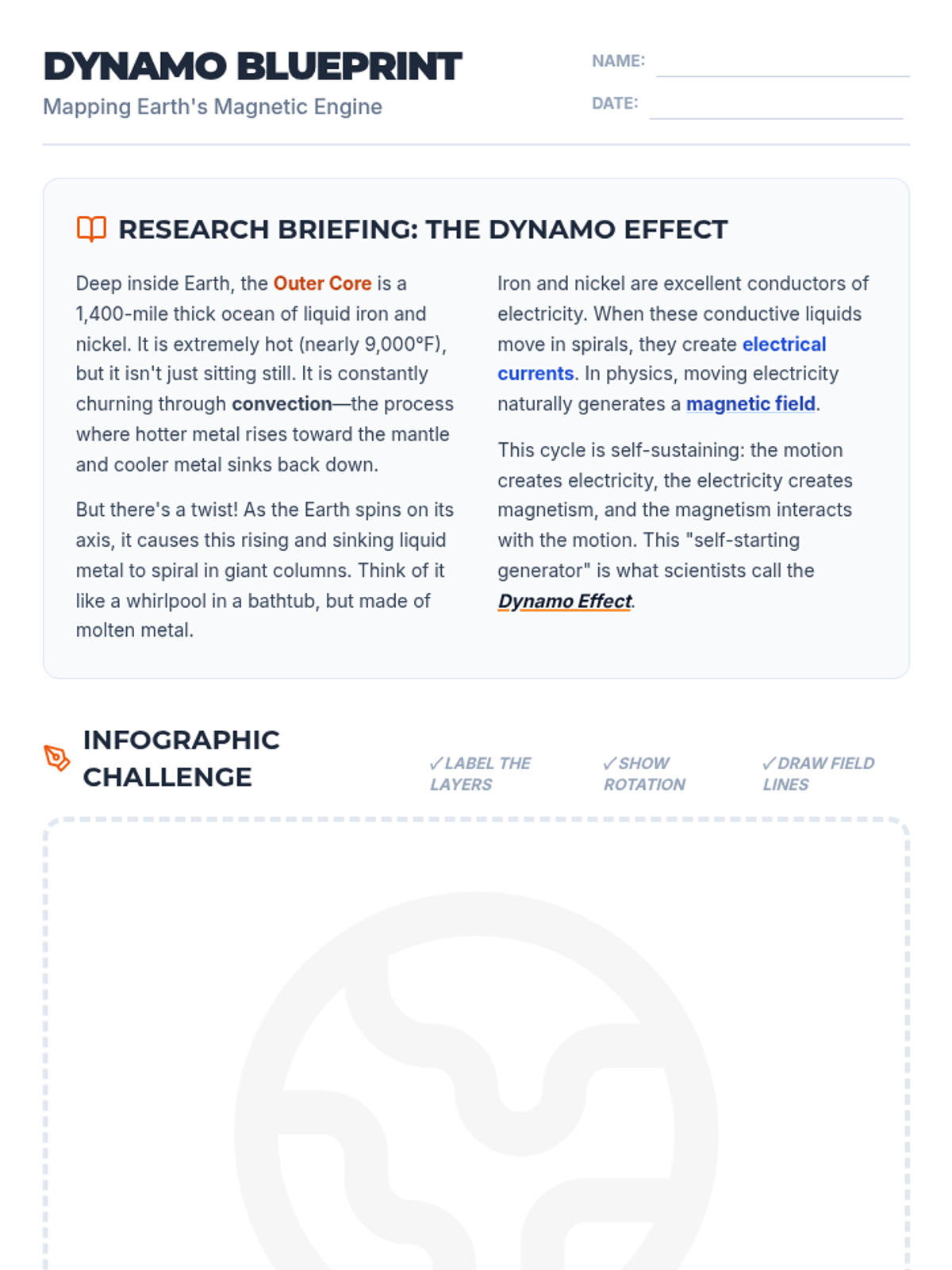 Students investigate how the spinning liquid metal in Earth's outer core generates the planet's magnetic field through the Dynamo Effect. They will view a video, read about magnetism, and create an infographic explaining this relationship.