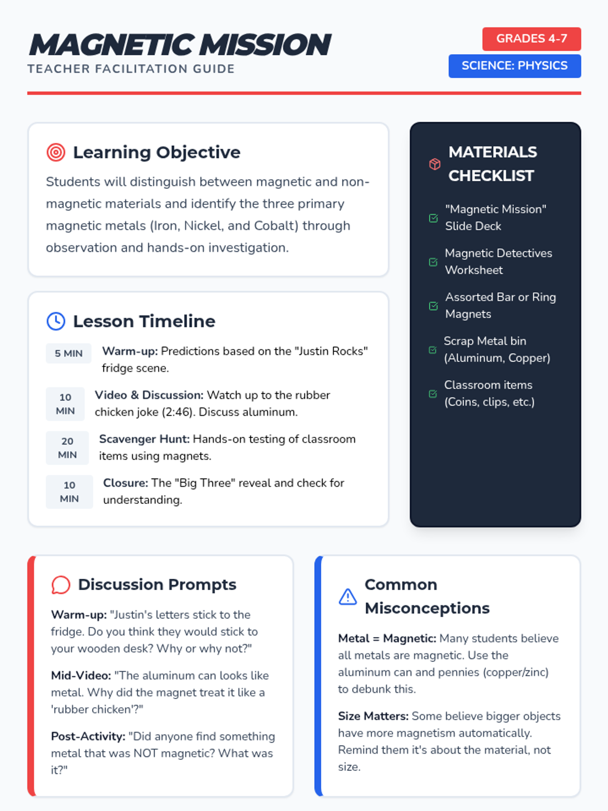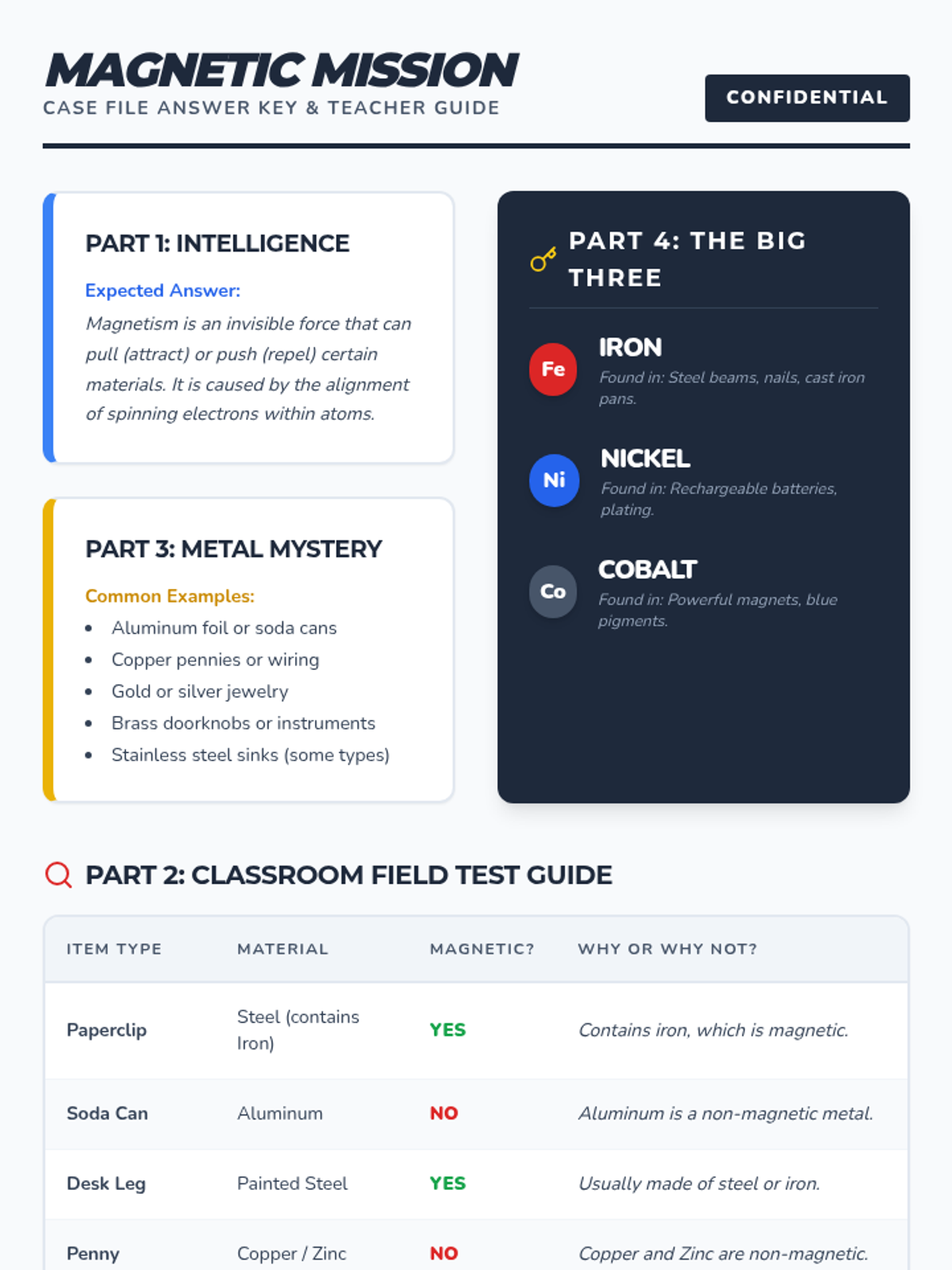 A hands-on introductory lesson where students investigate the properties of magnetism, conduct a classroom scavenger hunt, and identify the 'Big Three' magnetic metals: Iron, Nickel, and Cobalt.