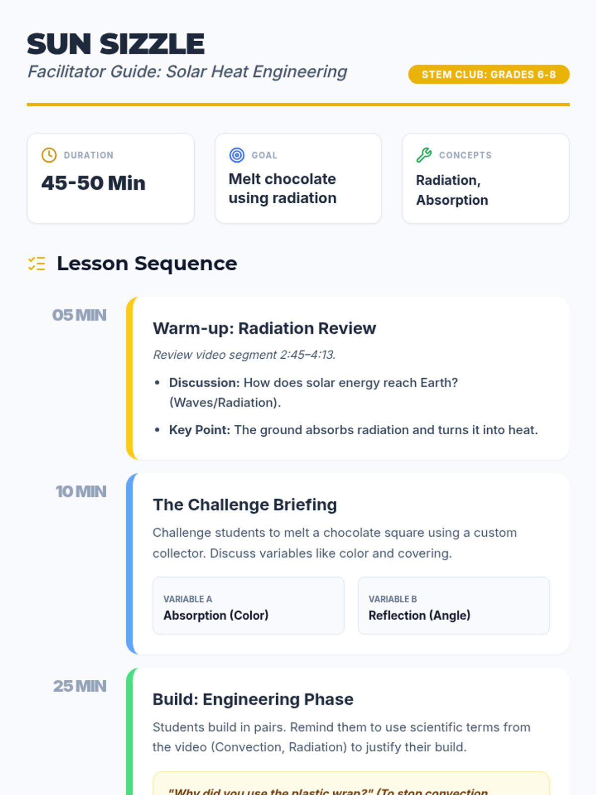 A hands-on engineering challenge where students design and build solar collectors to melt chocolate, applying concepts of radiation, absorption, and insulation.