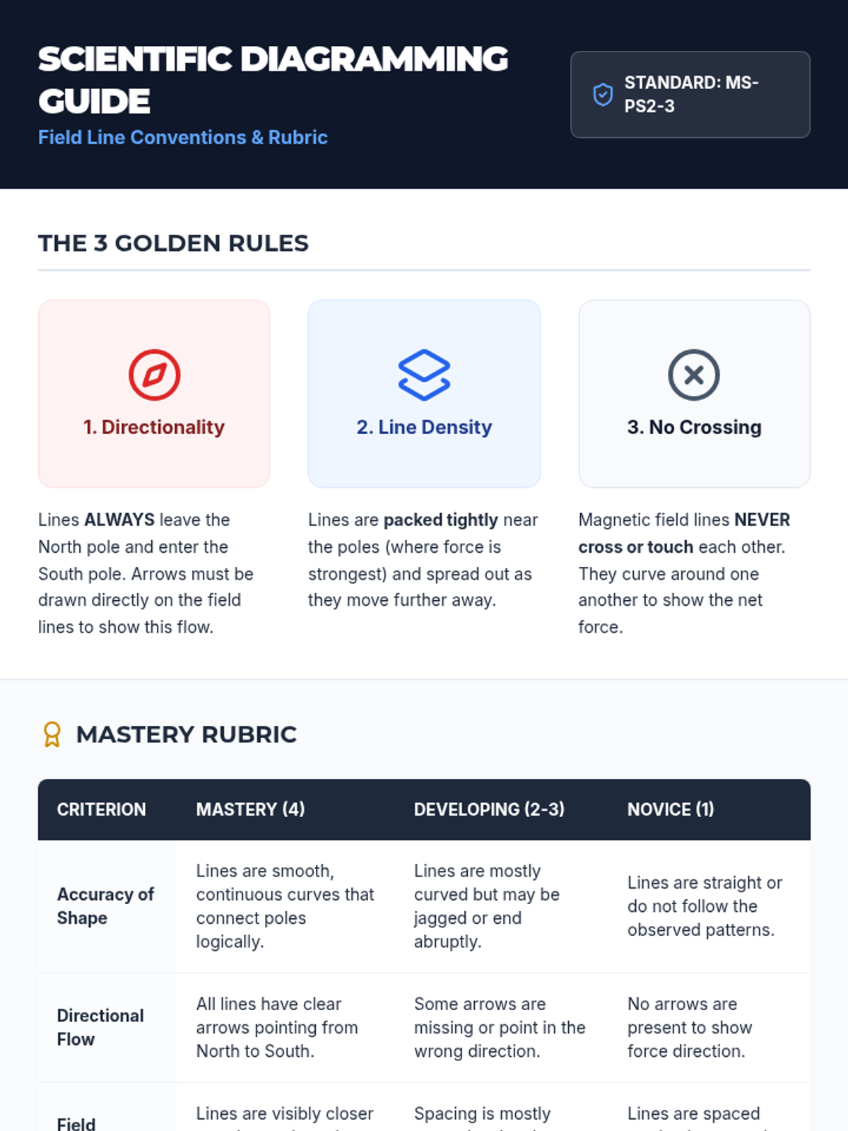 Students observe magnetic field patterns through iron filing demonstrations and learn to translate these observations into formal scientific diagrams using vector arrows and field line conventions.