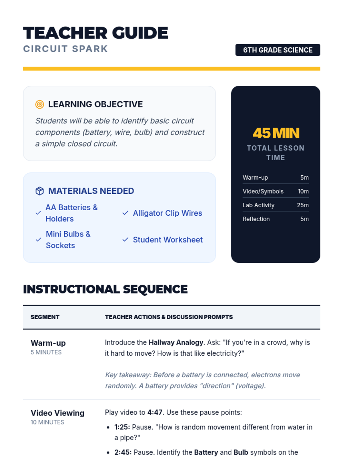 Students will learn the fundamentals of electric circuits by watching an instructional video, identifying schematic symbols, and building a physical closed circuit with batteries, wires, and bulbs.