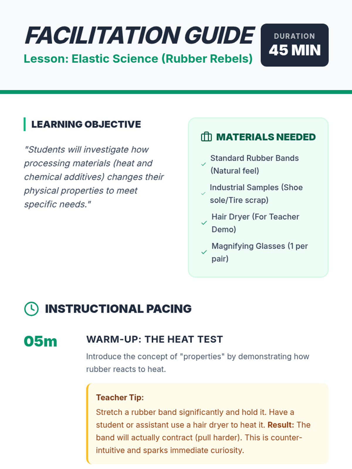 A hands-on science lesson investigating how processing and heat change the properties of rubber, moving from natural latex to high-performance industrial products.