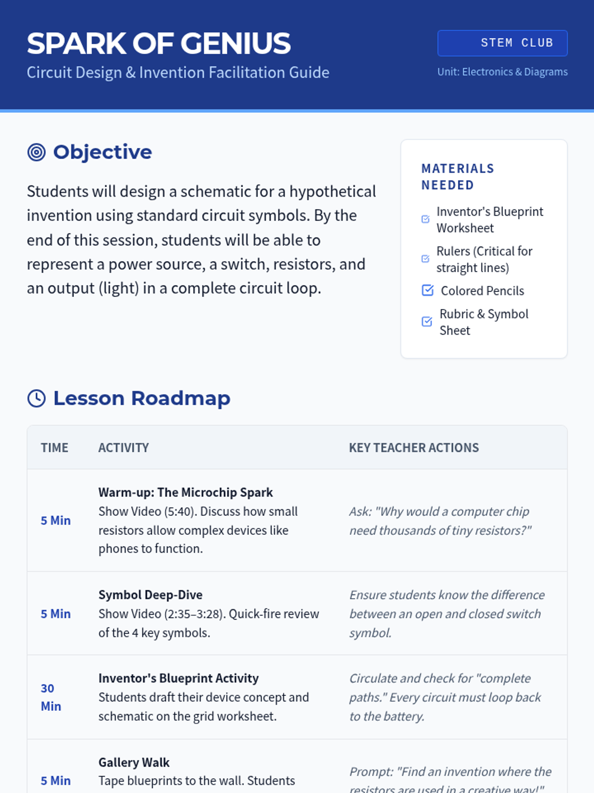 Students will design a circuit diagram for a hypothetical invention after reviewing electronic symbols and exploring how microchips use resistors. The lesson culminates in a 'Gallery Walk' where students showcase their 'Inventor's Blueprints'.