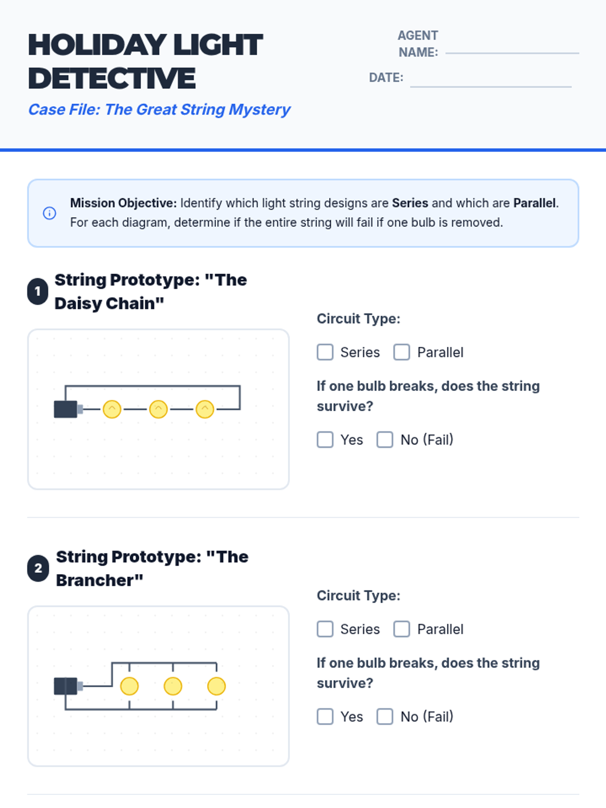 Students investigate the differences between series and parallel circuits through a real-world holiday light mystery, exploring why parallel circuits are essential for modern electrical systems.
