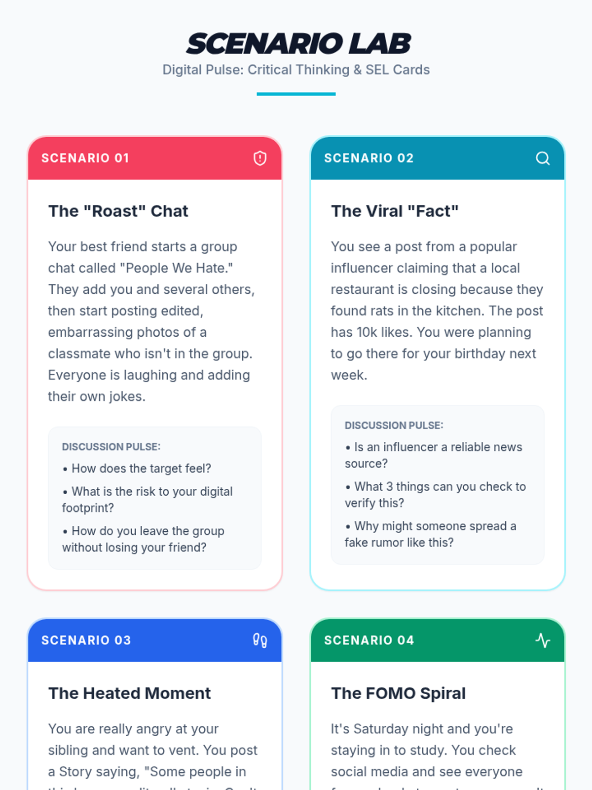 A lesson focused on navigating the complexities of digital life, covering social media etiquette, privacy boundaries, and cyberbullying prevention through realistic scenario-based learning.