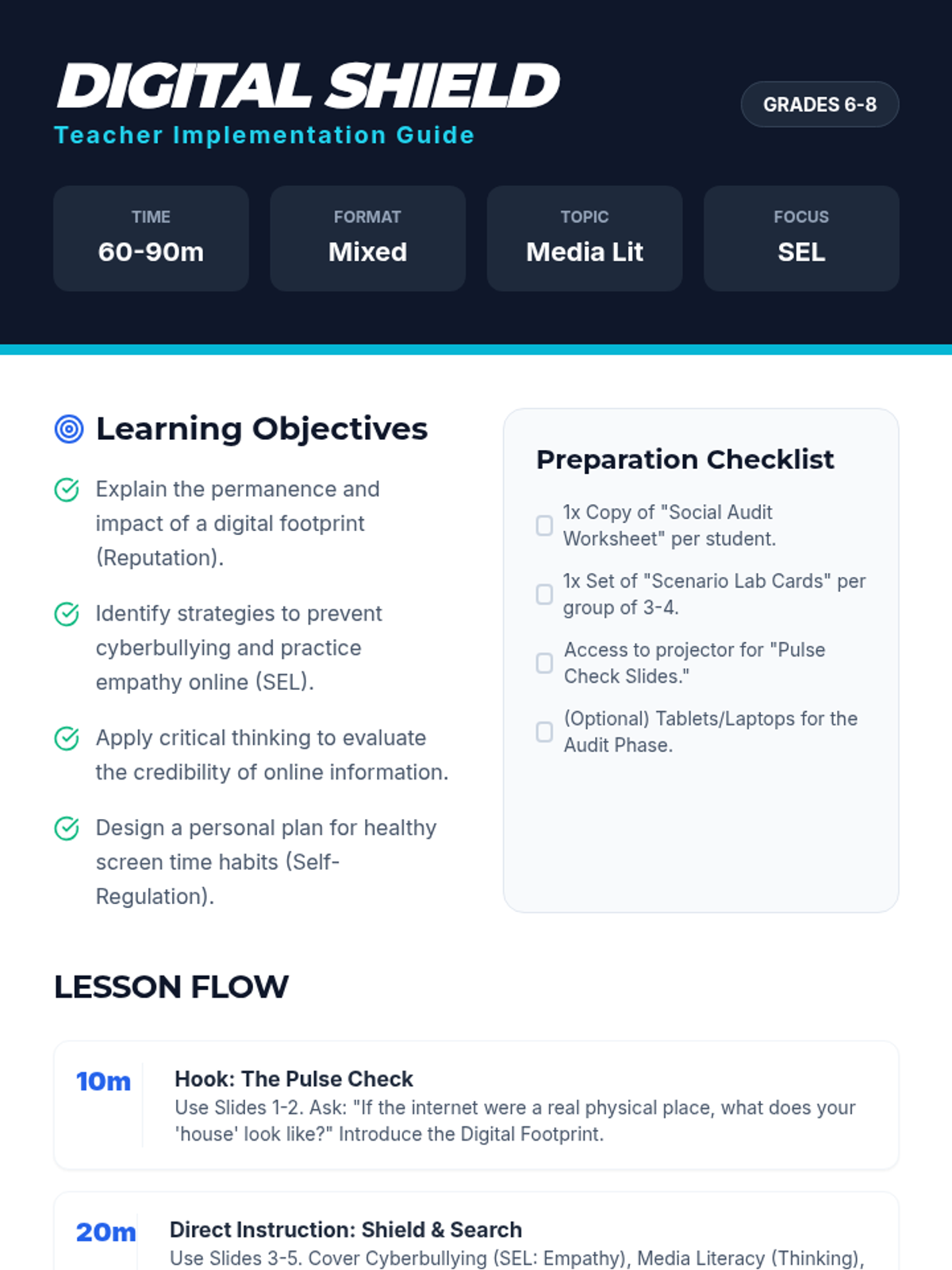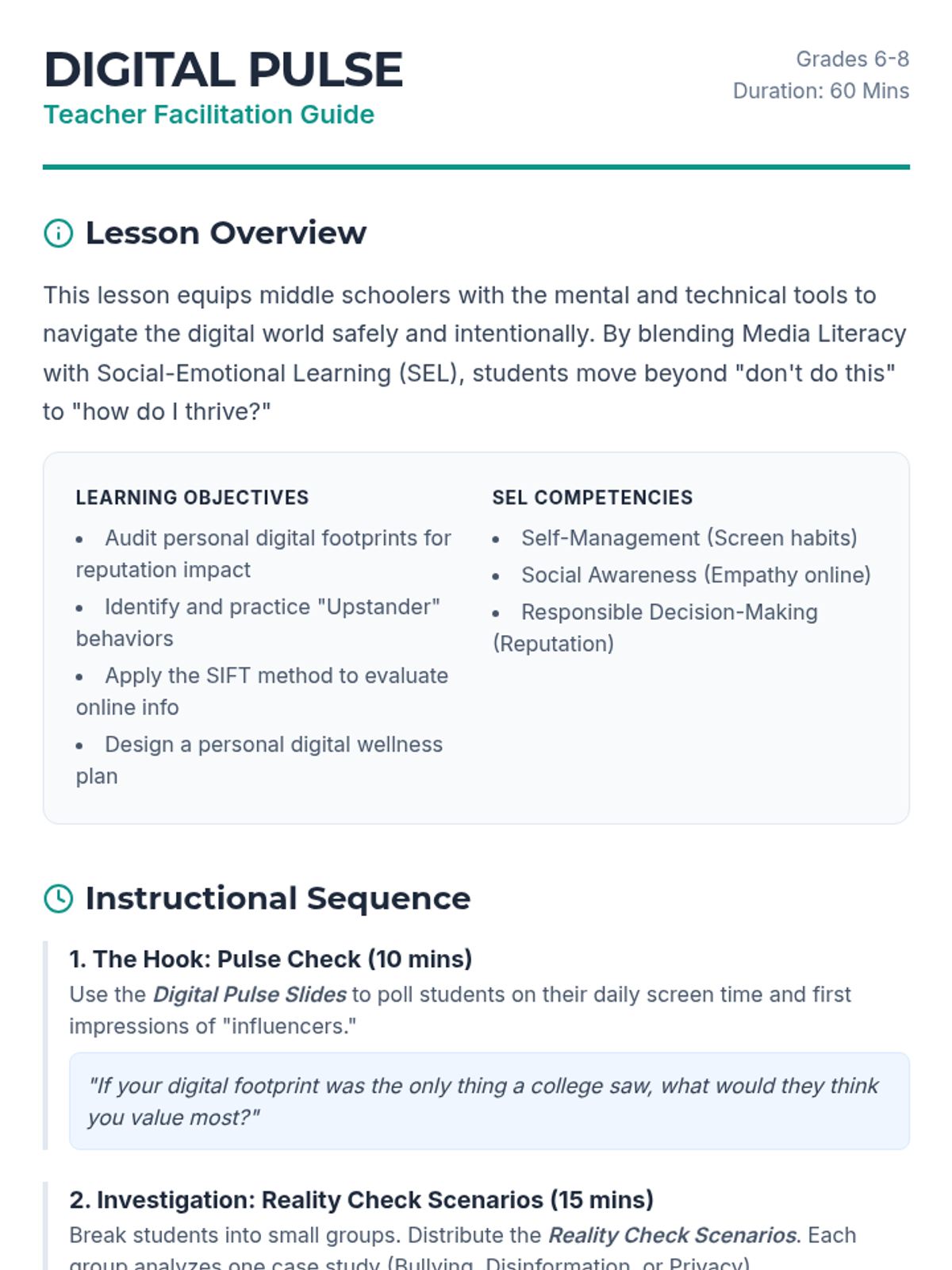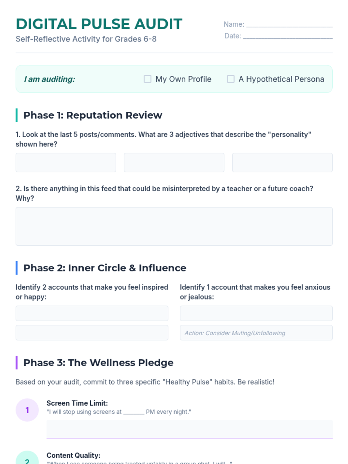 A comprehensive middle school lesson focusing on digital wellness, social media literacy, and SEL-aligned online behaviors. Students explore their digital footprint, practice critical media evaluation, and develop healthy screen habits through scenario-based learning and a personal digital audit.