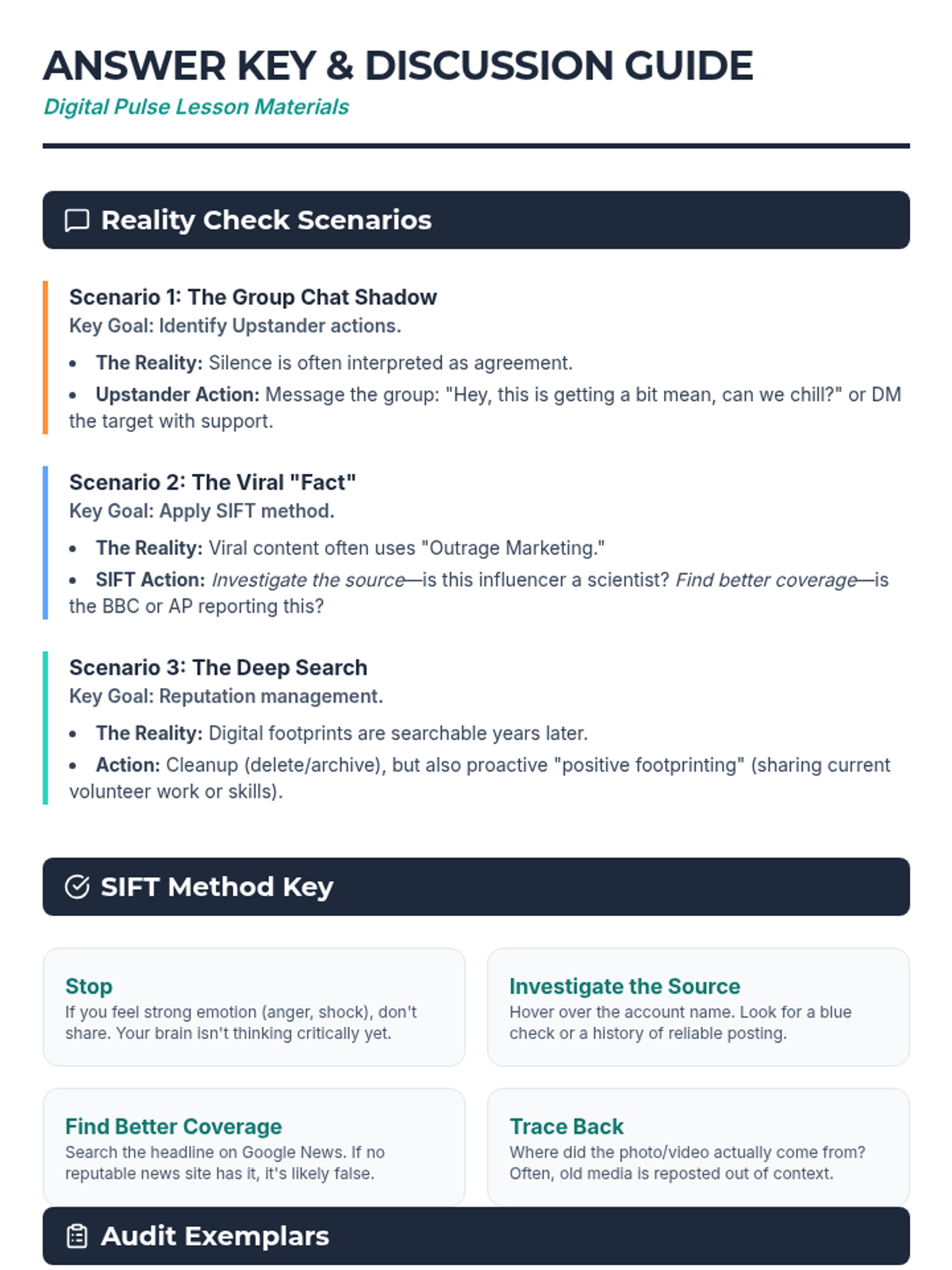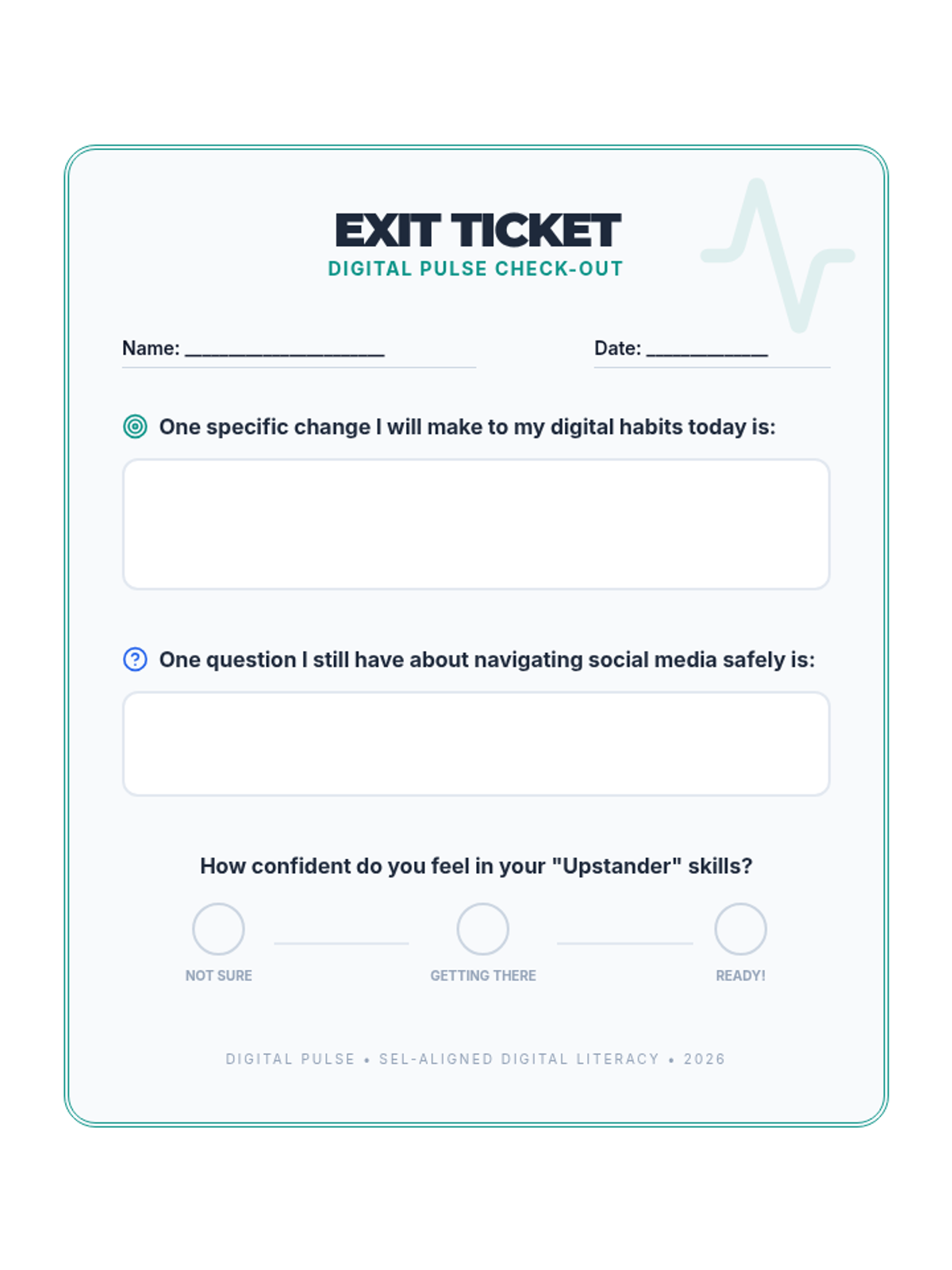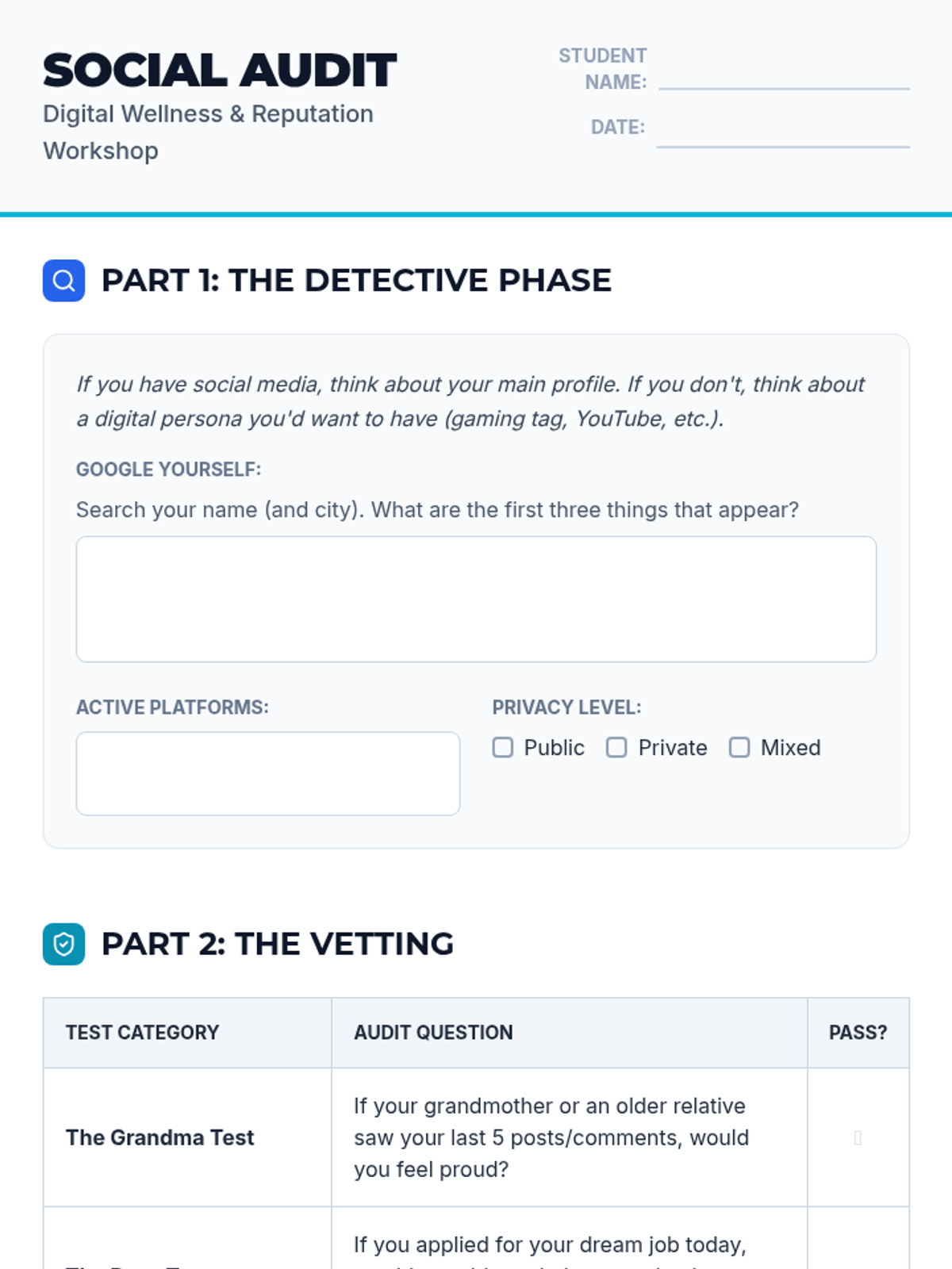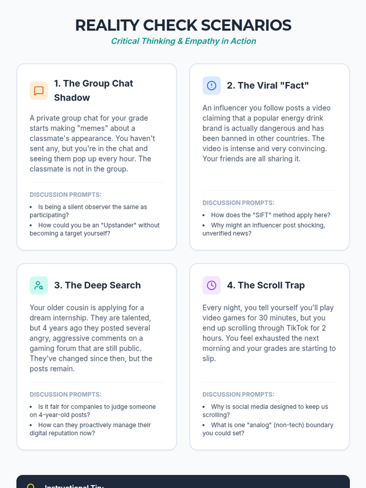 A comprehensive middle school lesson focusing on digital wellness, social media literacy, and SEL-aligned online behaviors. Students explore their digital footprint, practice critical media evaluation, and develop healthy screen habits through scenario-based learning and a personal digital audit.
