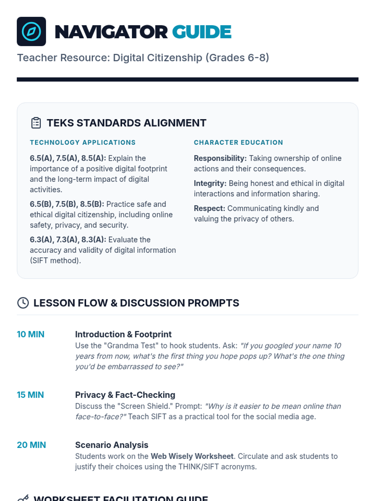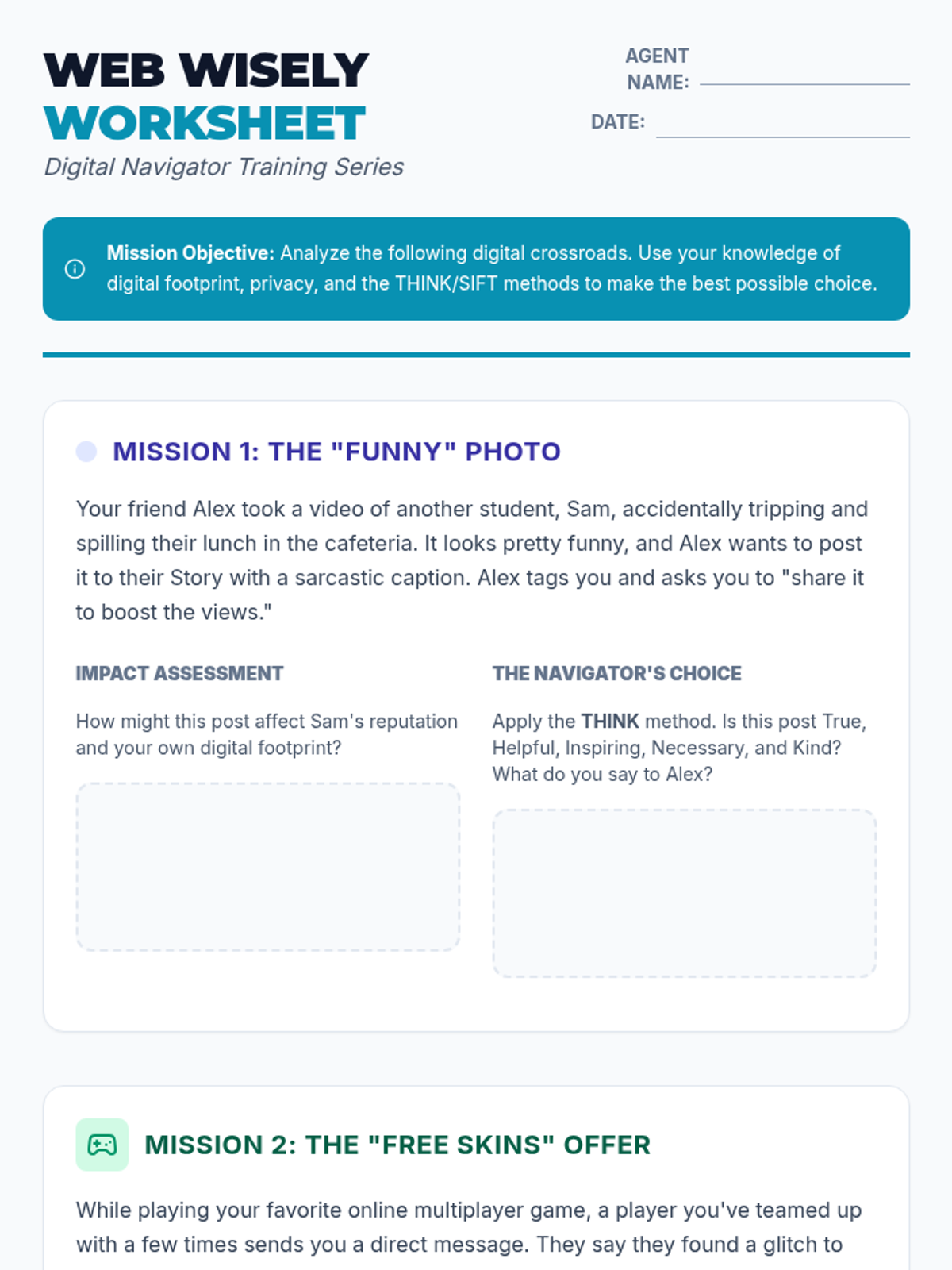 A comprehensive lesson for grades 6-8 focused on digital citizenship, online safety, and responsible communication. Students explore their digital footprint, privacy settings, and ethical decision-making through real-world scenarios in gaming and social media.