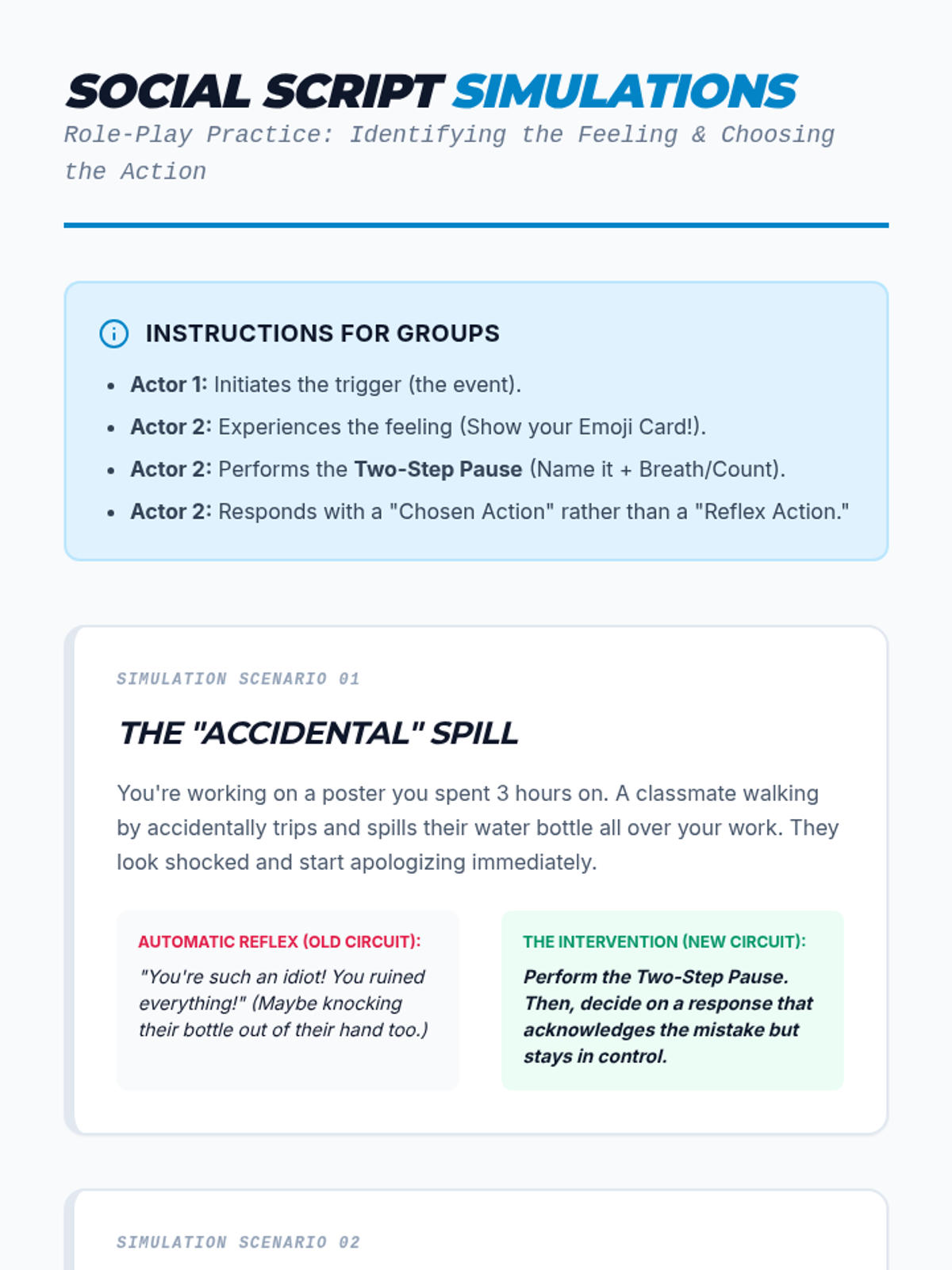 A social-emotional learning lesson designed for students with trauma backgrounds and impulse control challenges. It focuses on 'Scene Scanning'—assuming positive intent and dissecting social interactions through a detective-style lens to improve perspective-taking and reduce reactivity.