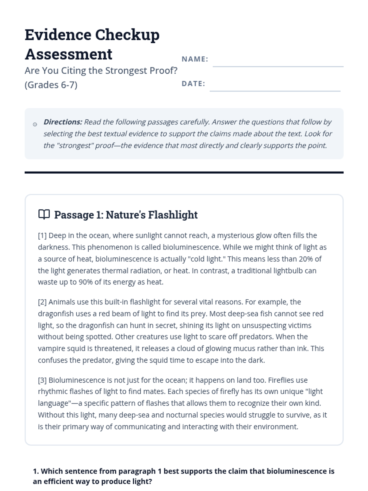 A diagnostic mini-assessment and instructional resource focused on RI.6-7.1, teaching students to identify and cite the strongest textual evidence to support analysis of nonfiction texts.