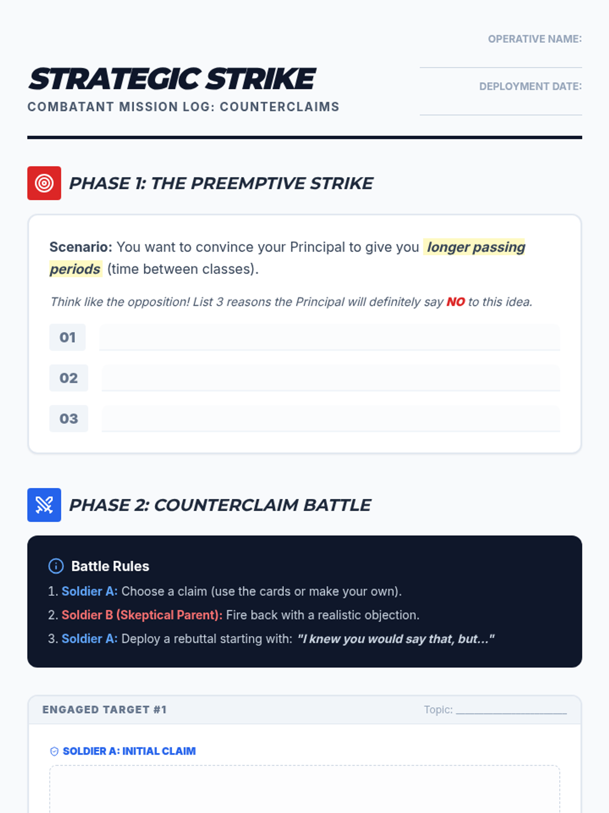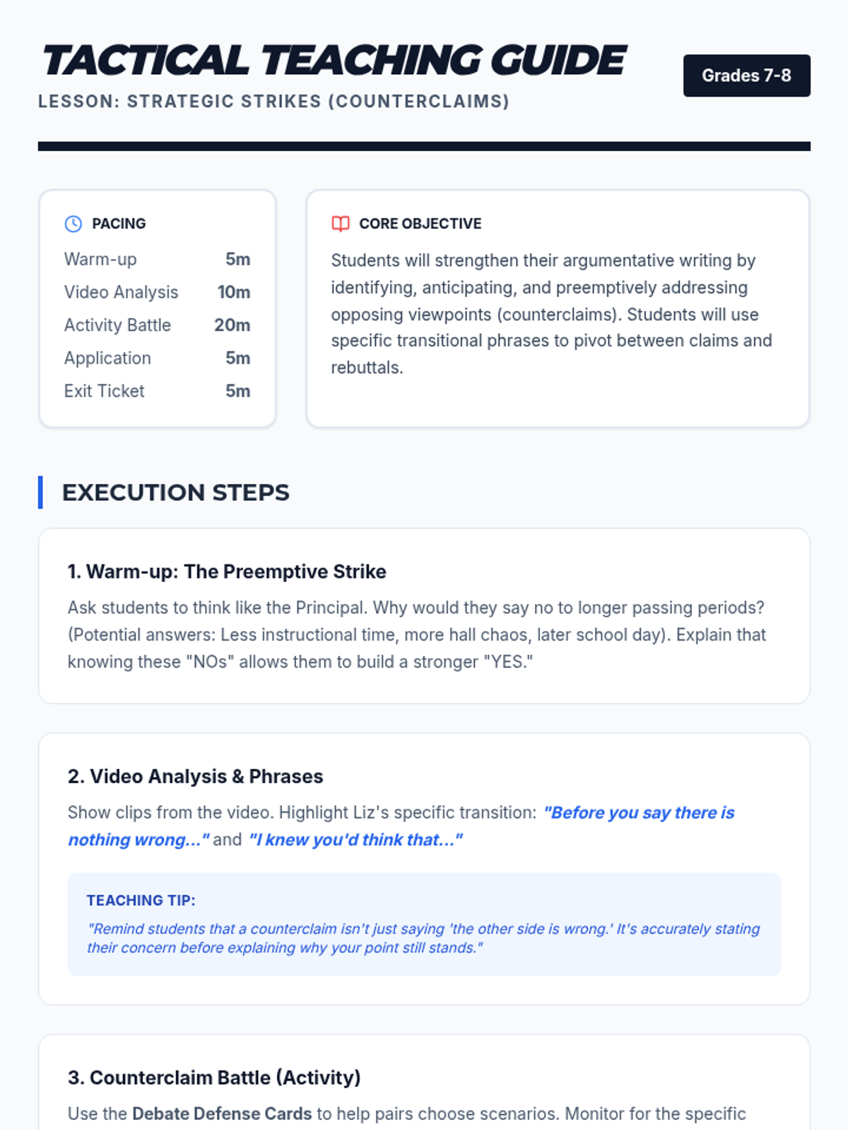 A dynamic lesson for middle schoolers to master the art of the counterclaim, using the 'preemptive strike' strategy to win arguments through logic and audience awareness.