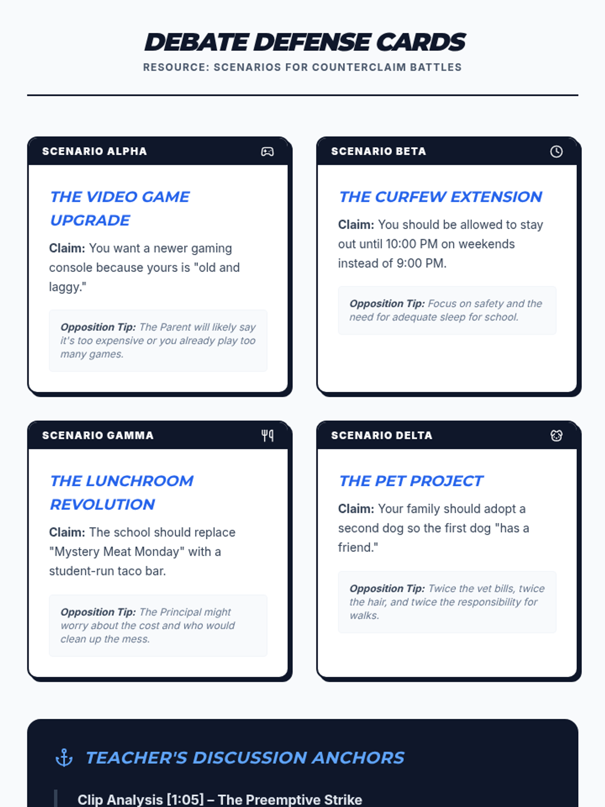 Students learn to strengthen their arguments by anticipating and addressing counterarguments before they are even raised. Using a relatable video analysis of a teen negotiating for a new phone, students practice the 'preemptive strike' technique using a specific 'Even though...' sentence structure.