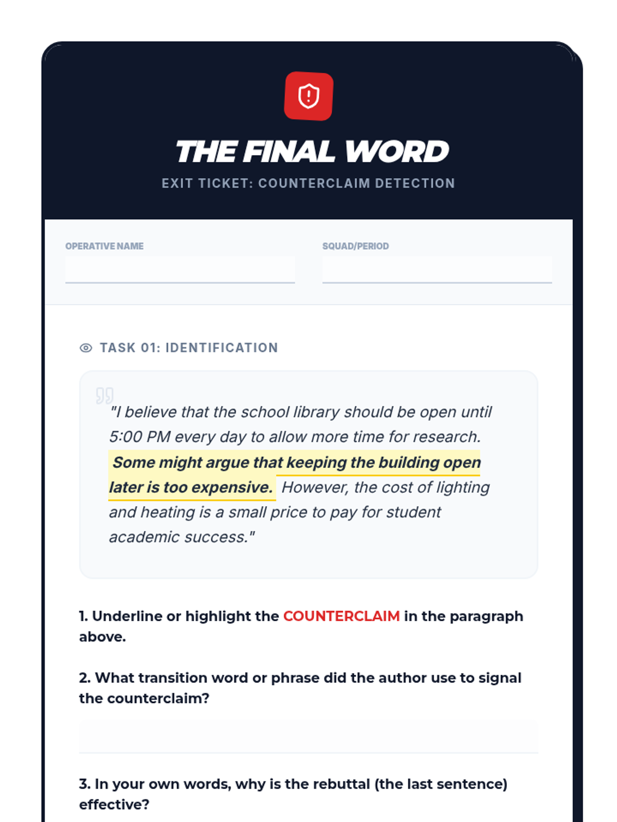 Students will learn to identify and craft effective counterclaims and rebuttals to strengthen their argumentative writing. The lesson uses a 'combat' metaphor to make the components of an argument memorable and engaging.