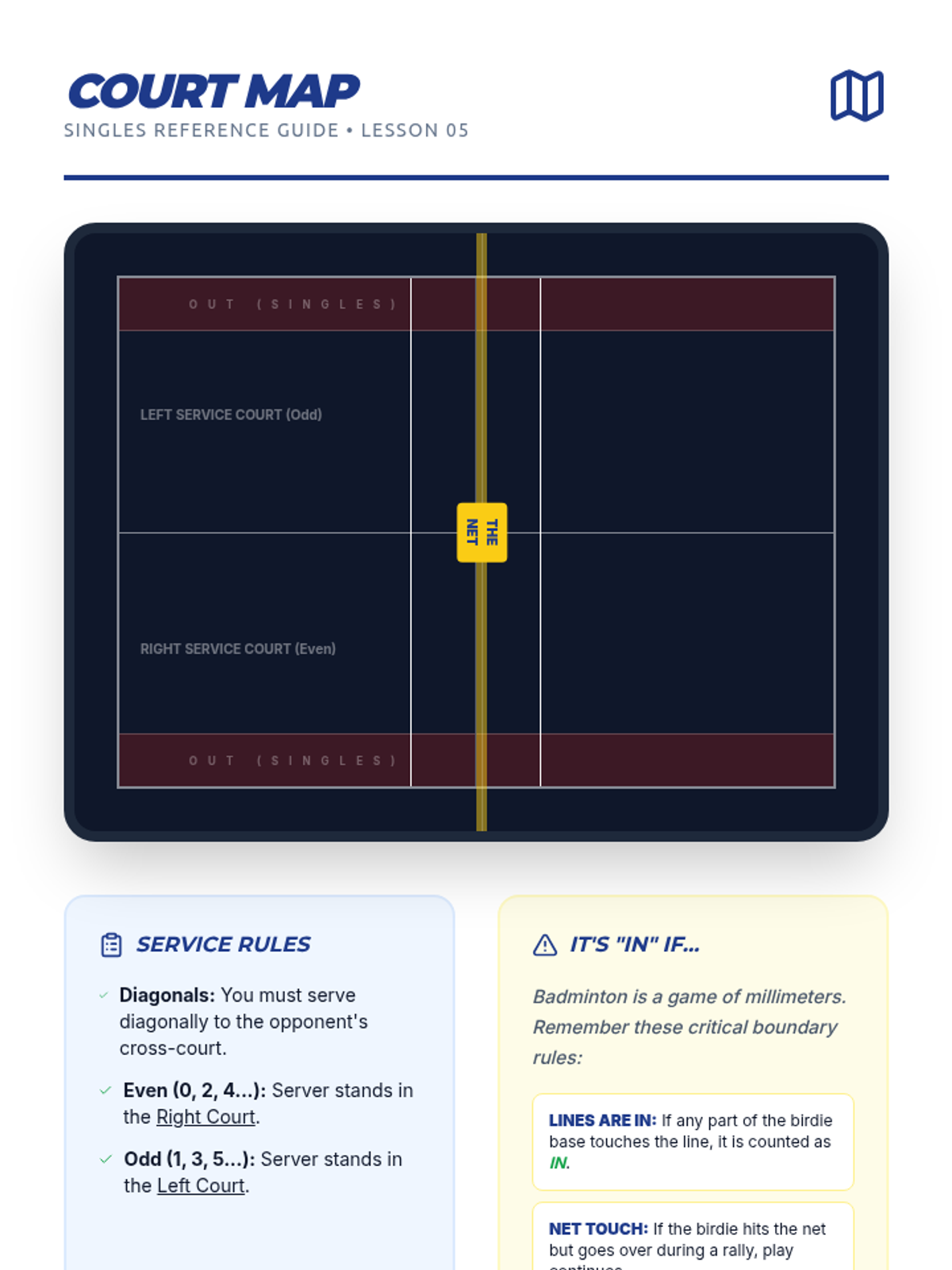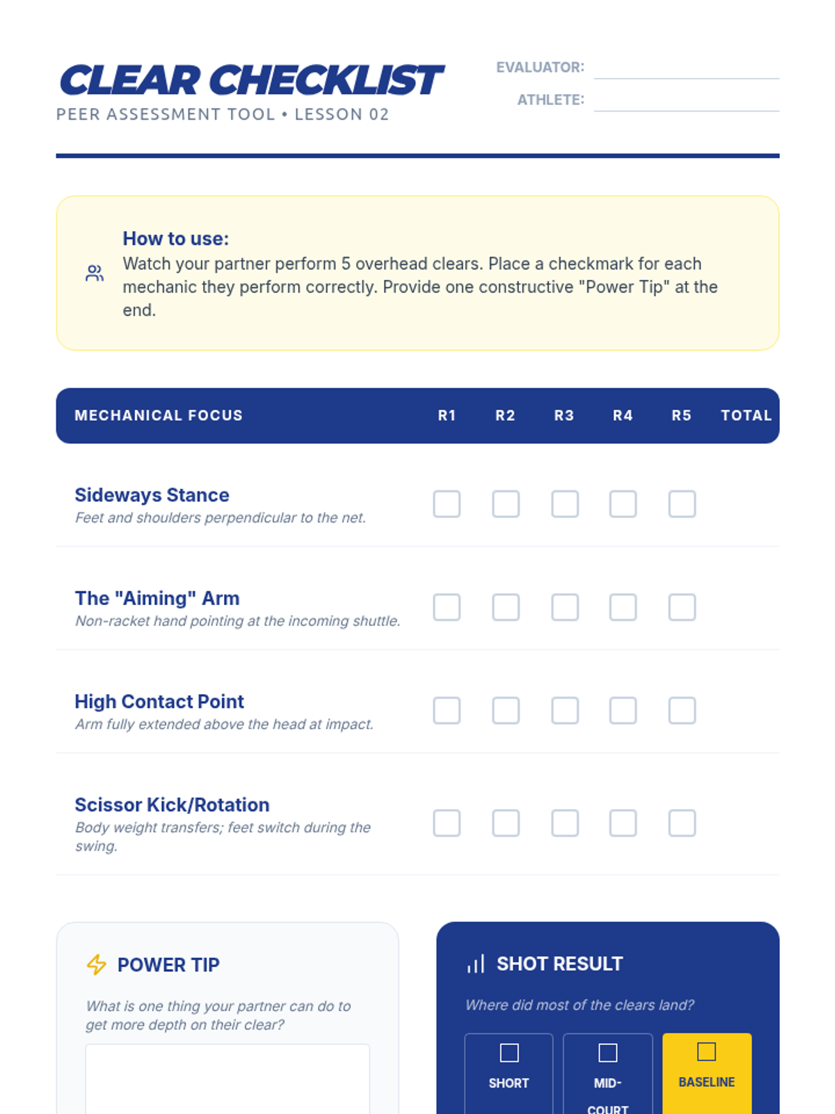 This lesson covers the overhead clear as a defensive tool and the essential footwork patterns (chassé and split-step) needed to recover and cover the court effectively.