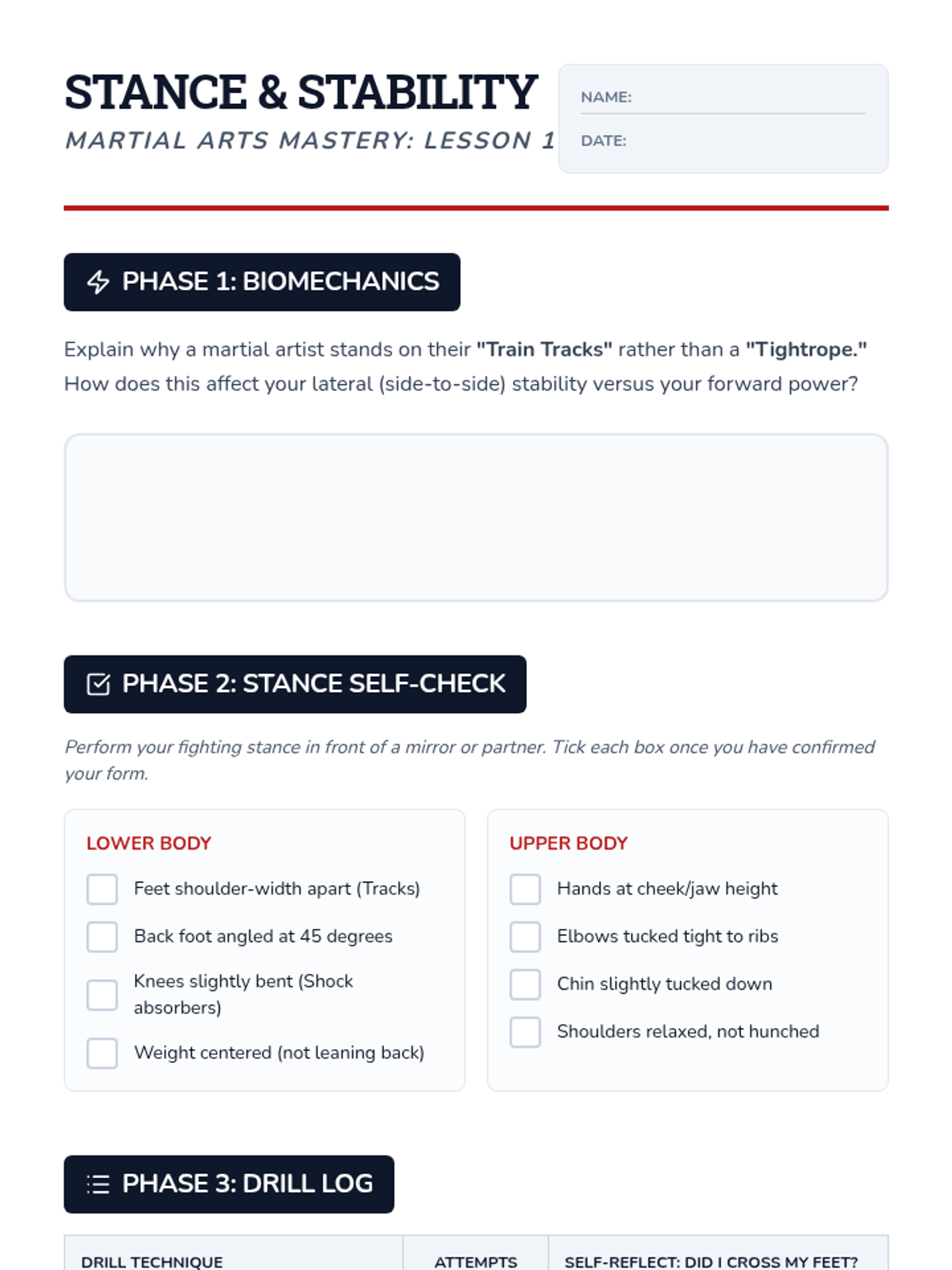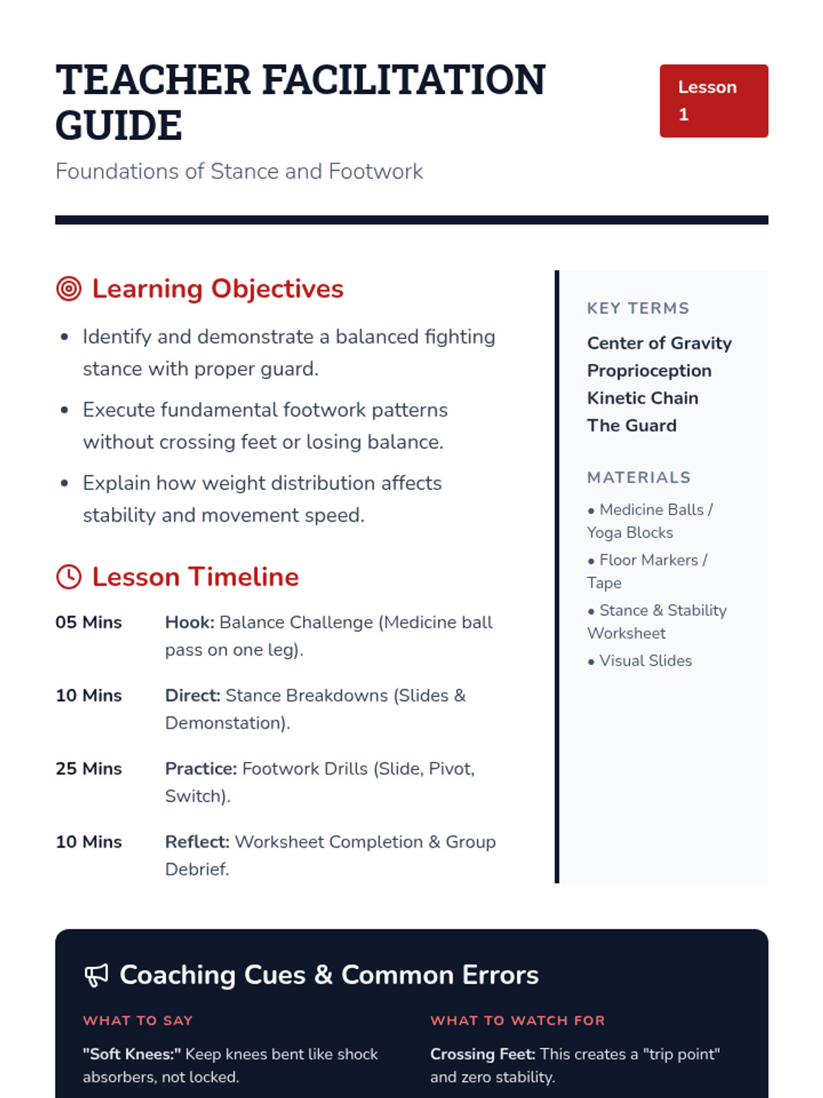 Introduction to neutral and fighting stances, weight distribution, and essential footwork patterns like stepping, sliding, and pivoting to maintain balance.