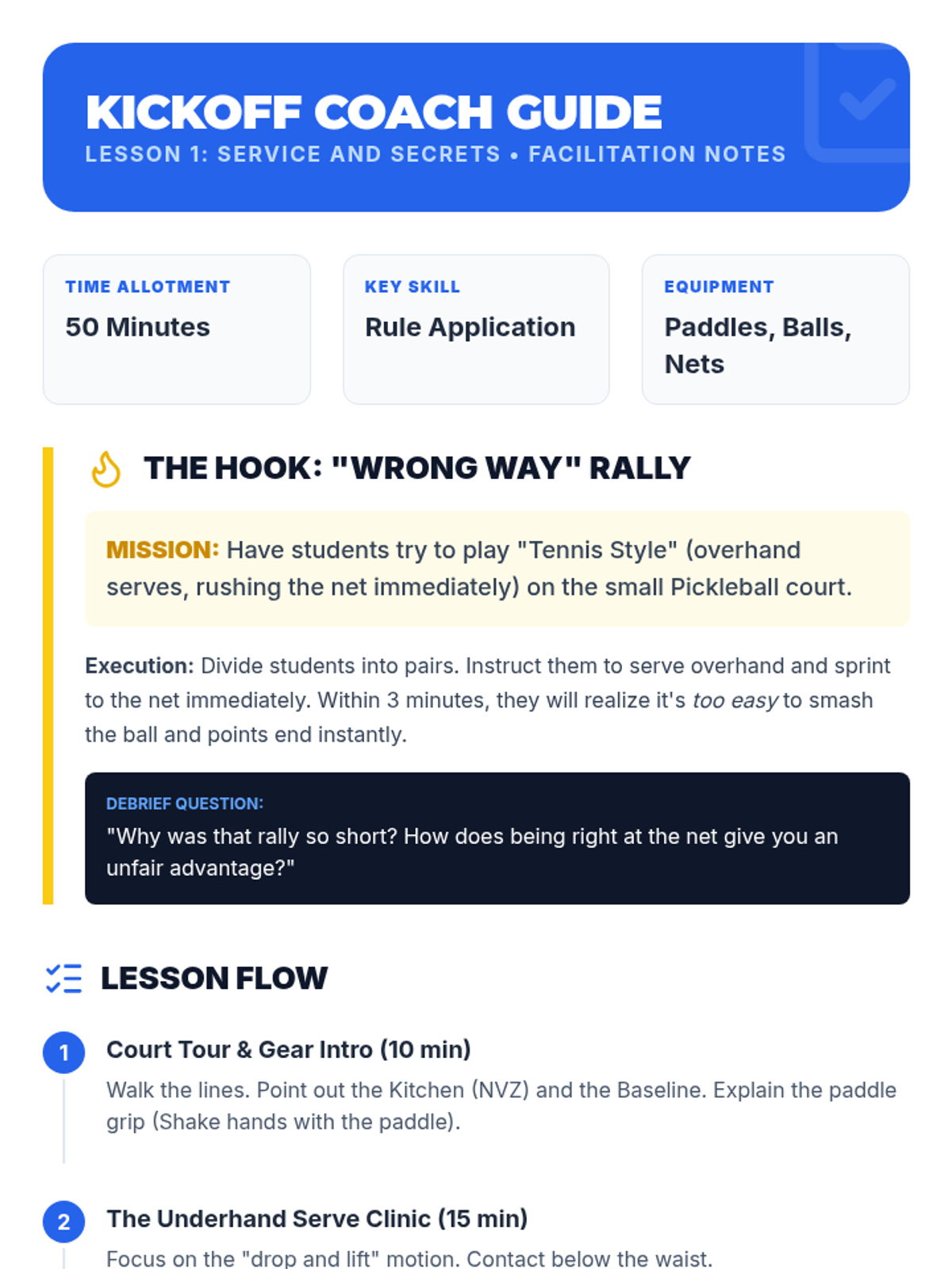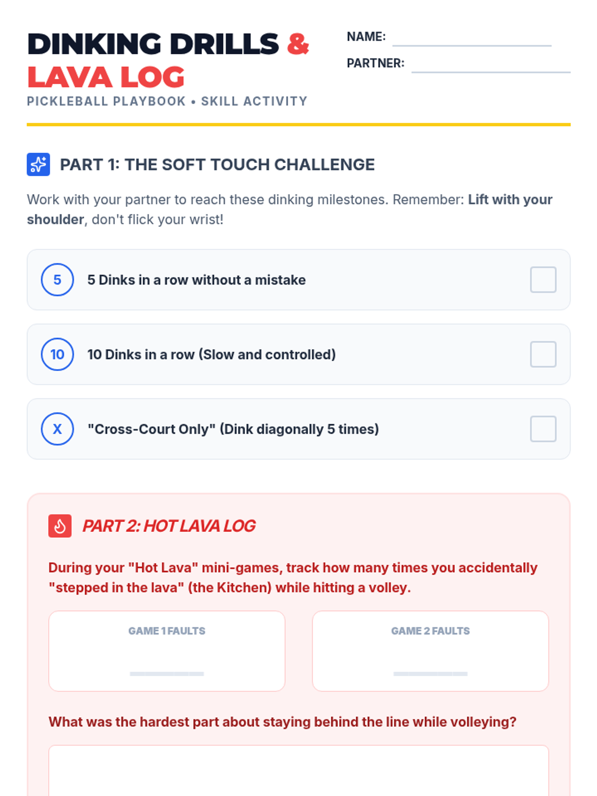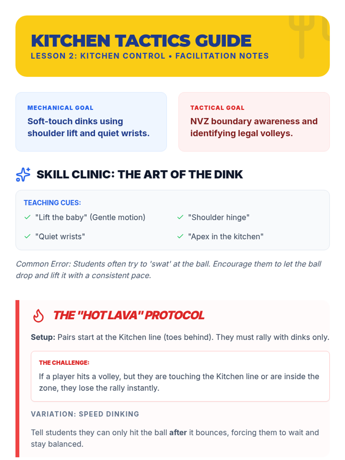 Focusing on the Non-Volley Zone (NVZ), students learn 'dinking' and legal volley mechanics. The 'Hot Lava' challenge reinforces the importance of staying behind the kitchen line for volleys.