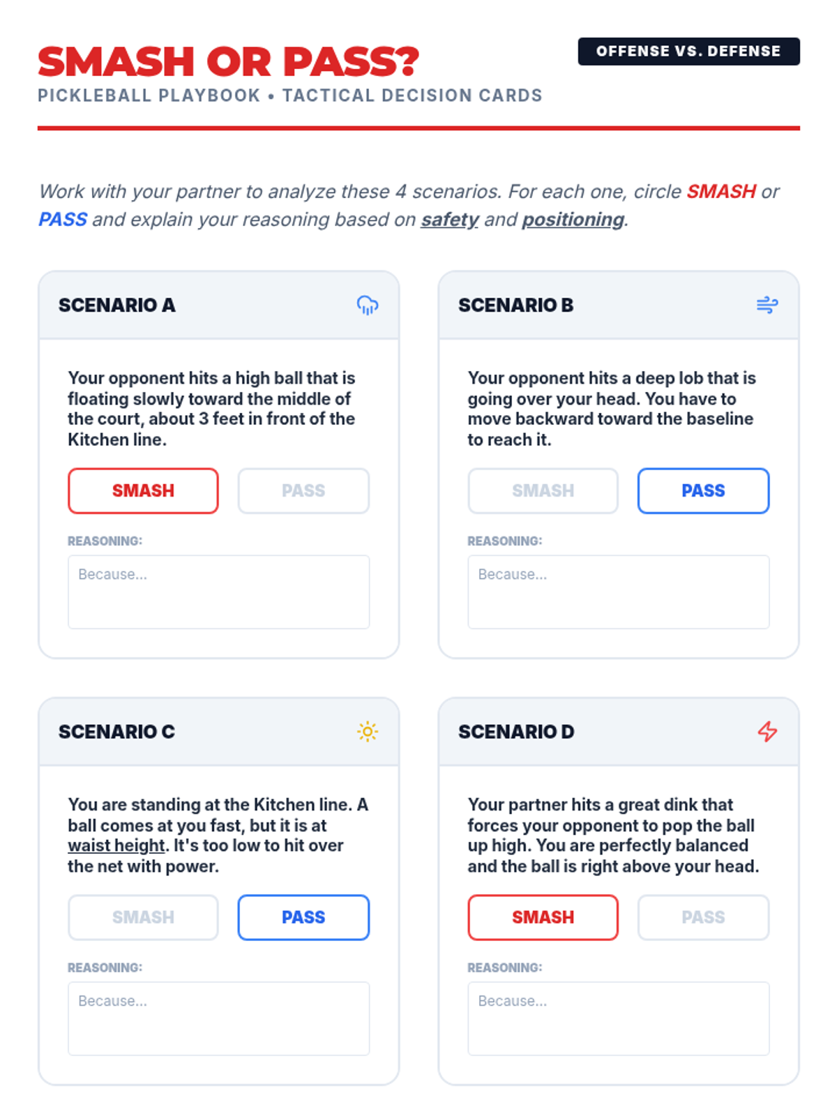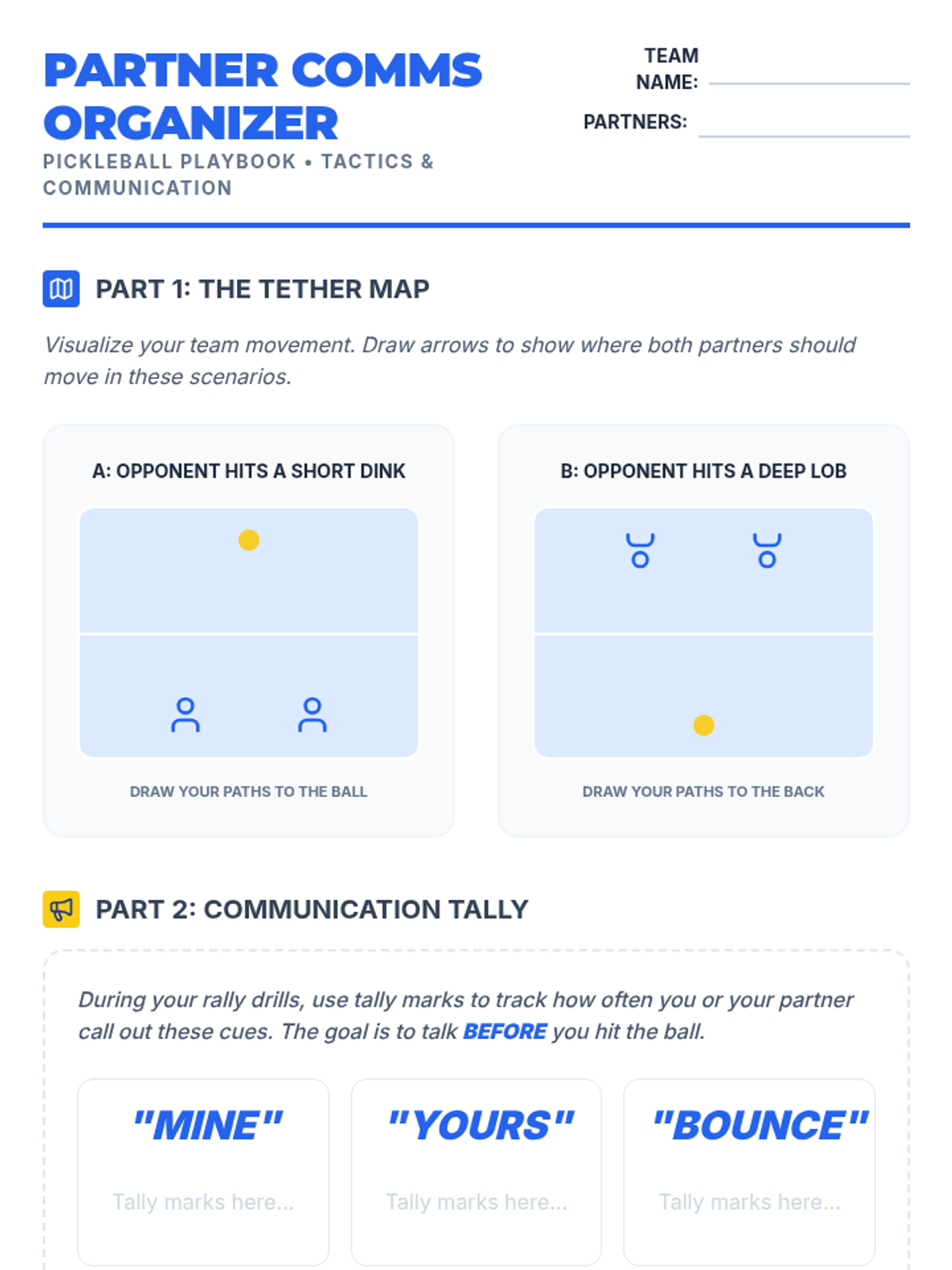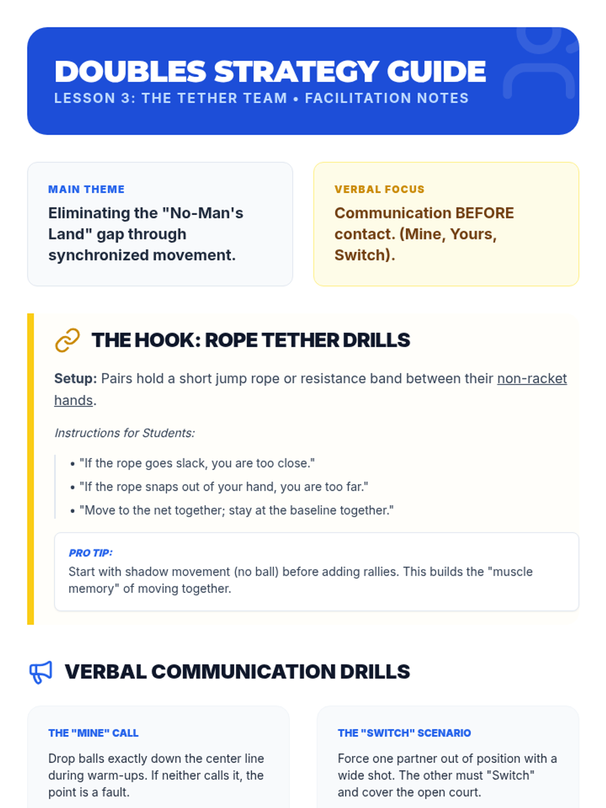 Students learn doubles strategies like side-by-side and front-back positioning with an emphasis on verbal communication.