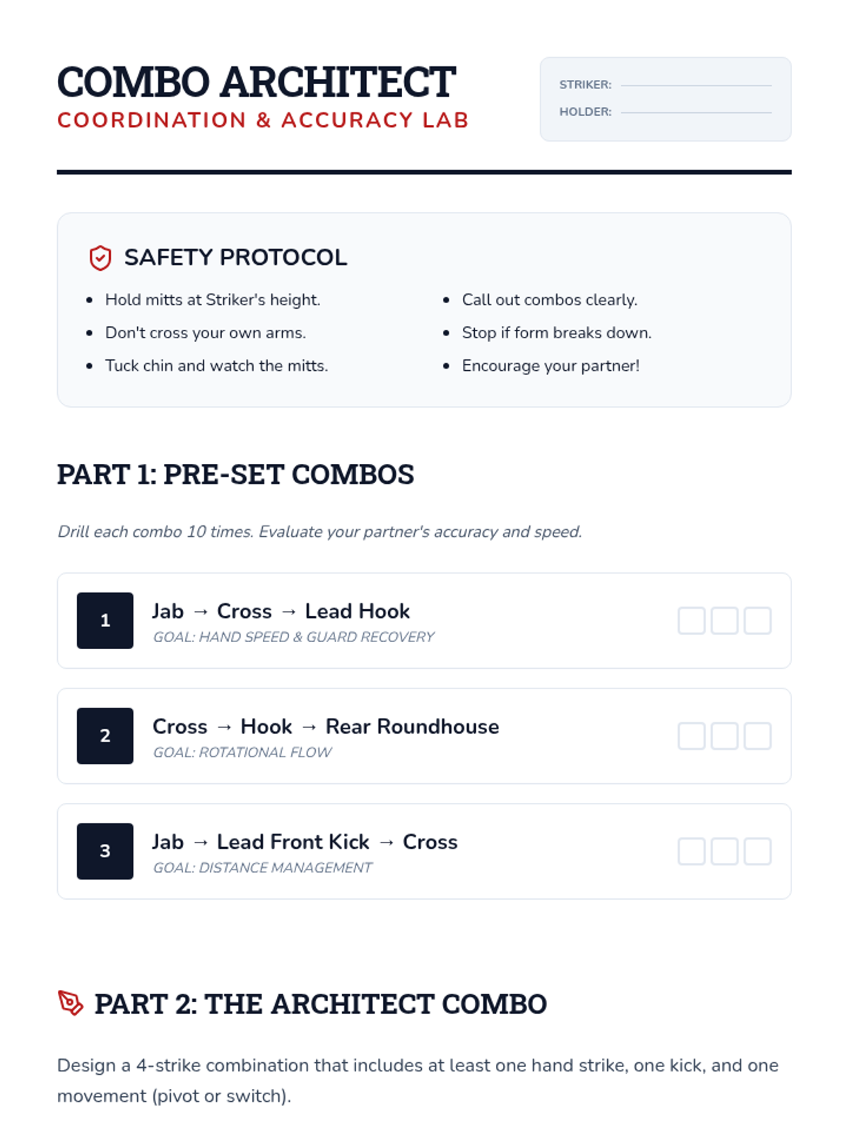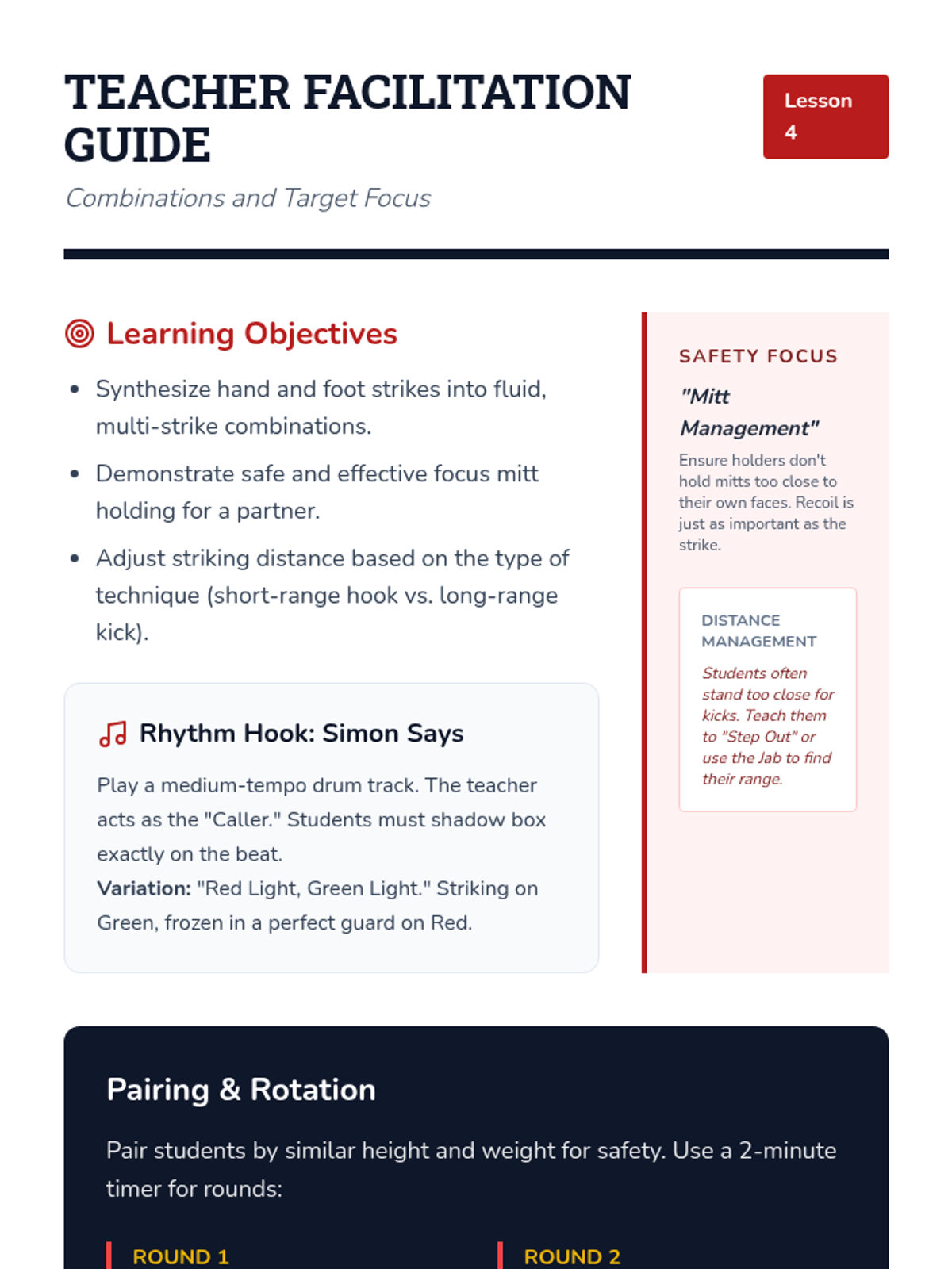 Integrating hand and foot techniques into fluid combinations using focus mitts to develop coordination and distance management.