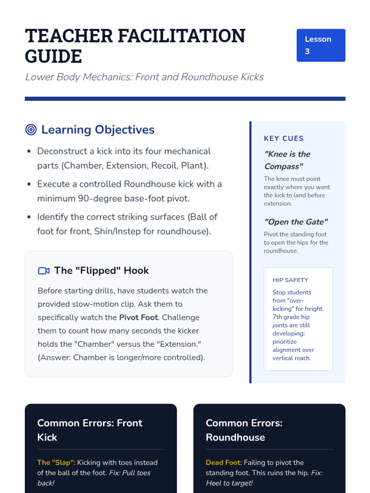 Introduction to the four-part mechanics of front and roundhouse kicks, focusing on balance, chambering, and hip safety.