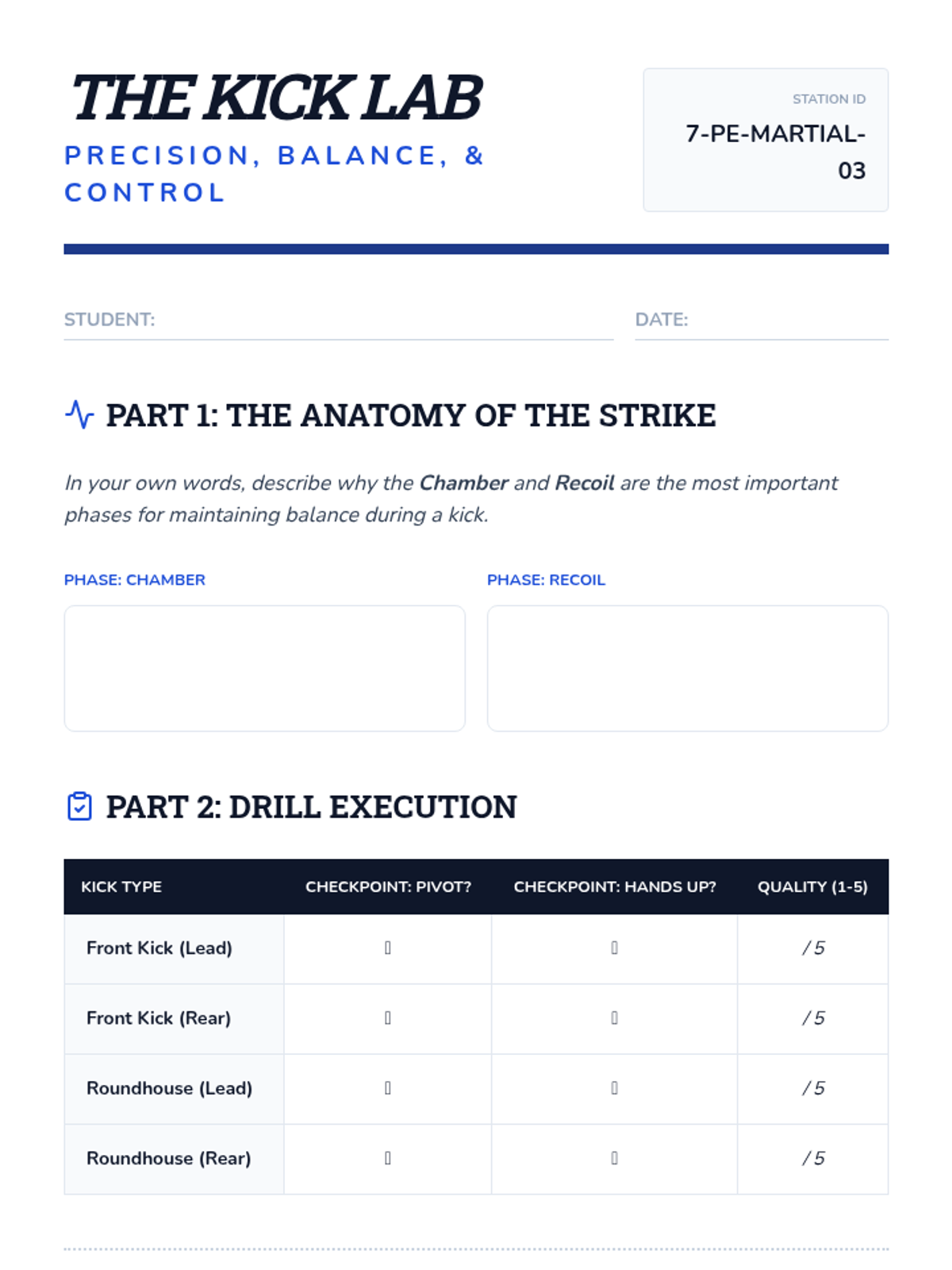 A high-energy culmination of the unit where students combine stances, footwork, and breath in reaction-based drills and agility circuits to improve motor recall.
