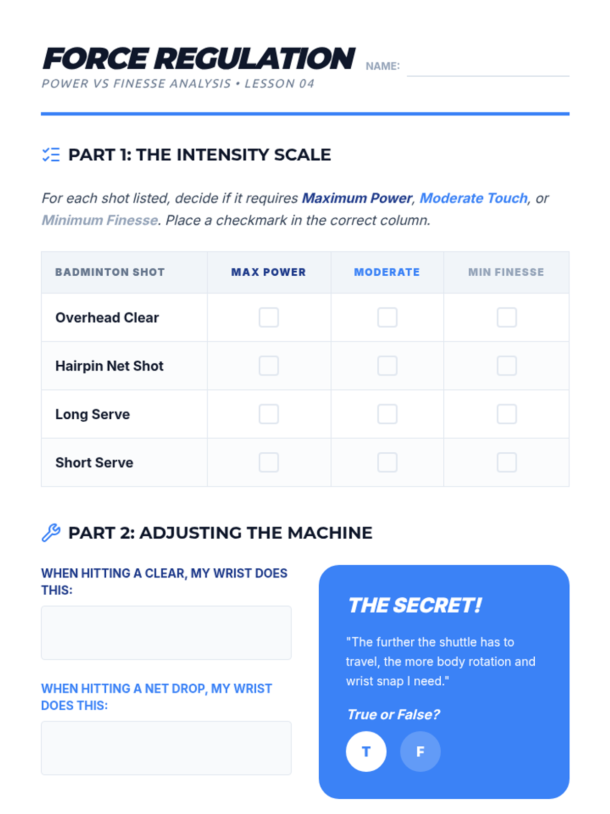 Students practice the art of deception by learning the drop shot and hairpin net shots. The focus is on racket head deceleration and moving the opponent through varied shot depth.