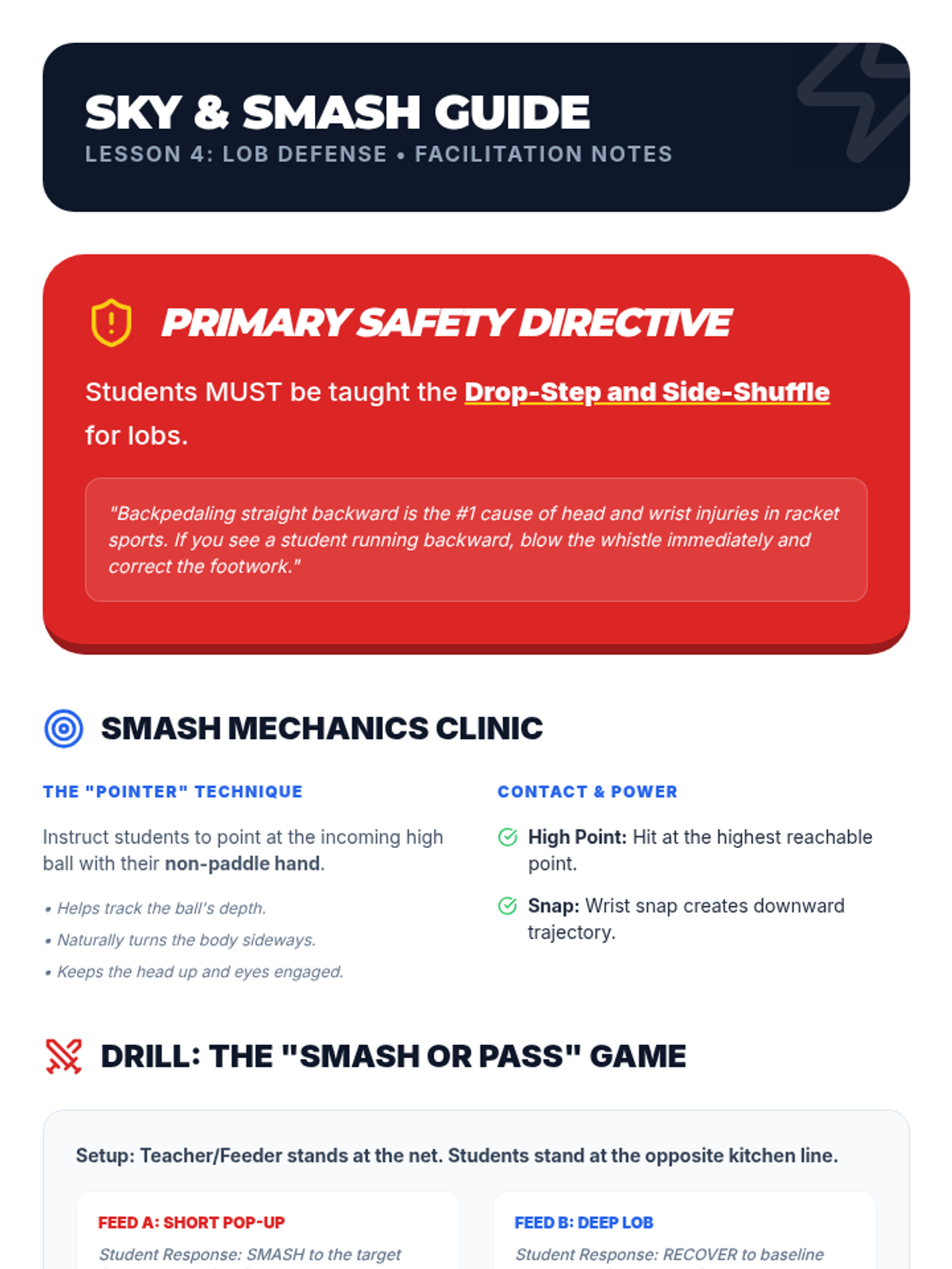 Focuses on the overhead clear, teaching students to use their full body for power and depth to push opponents to the baseline and regain recovery time.