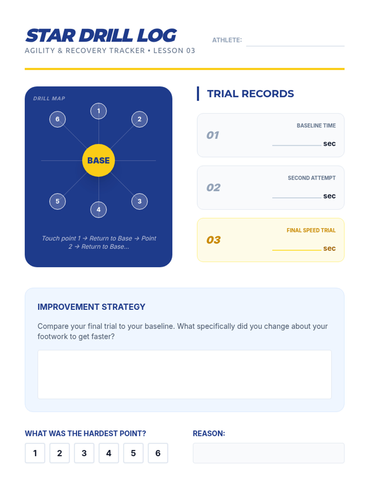 Emphasizes efficient footwork and the importance of the center base recovery through shadow badminton and the high-intensity 'Star Drill' challenge.
