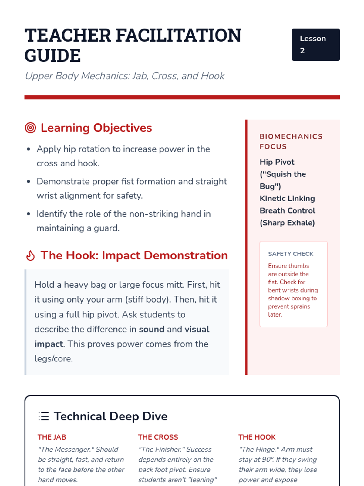 Focus on the mechanics of the jab, cross, and hook, emphasizing hip rotation, breath control, and proper hand safety.